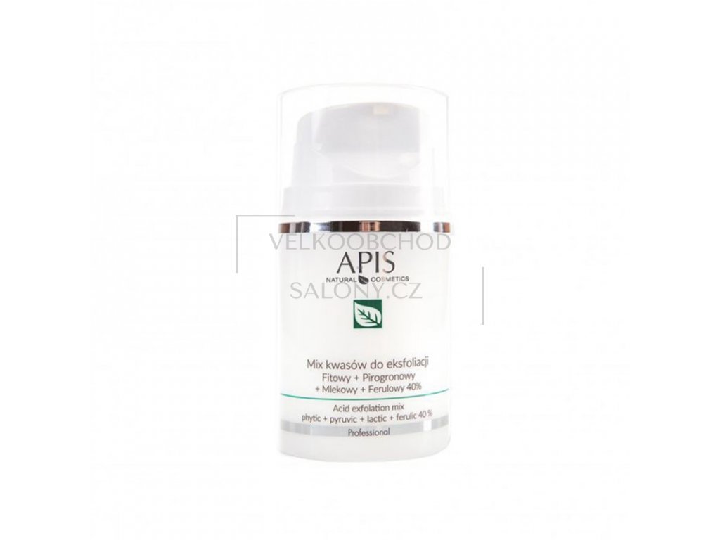 Apis Směs kyselin pro exfoliaci (fytová + pyrohroznová + mléčná + ferulová 40 %) se doporučuje pro pleť s projevy stárnutí, barevnými změnami, rozšířenými kapilárami a pro mastnou pleť se sklonem k akné a rozšířenými póry. Jet je inovativní kombinace čtyř kyselin s pH 1,4, která působí na mnoha úrovních a má mimořádné vlastnosti. Přípravek intenzivně exfoliuje zrohovatělou vrstvu epidermis, působí proti stárnutí, zmenšuje rozšířené kapiláry a zesvětluje barevné změny. Uzavírá rozšířené kožní póry a má bakteriostatický účinek. Vykazuje také antioxidační aktivitu. Acid mix je přípravek určený k chemickému peelingu.