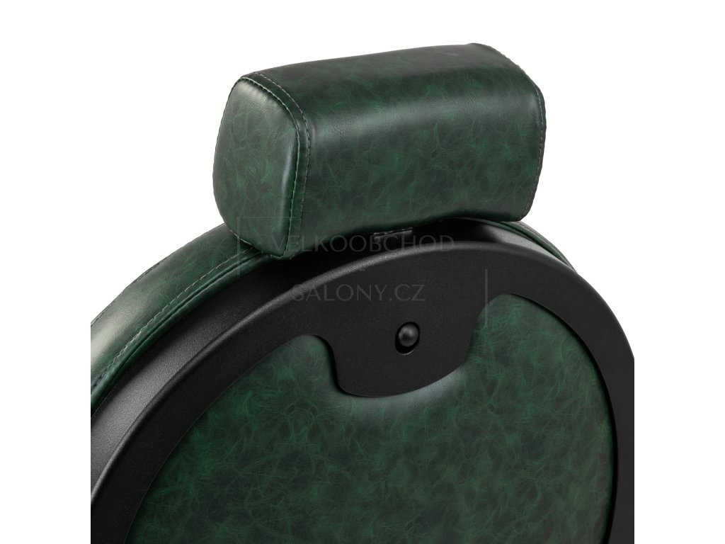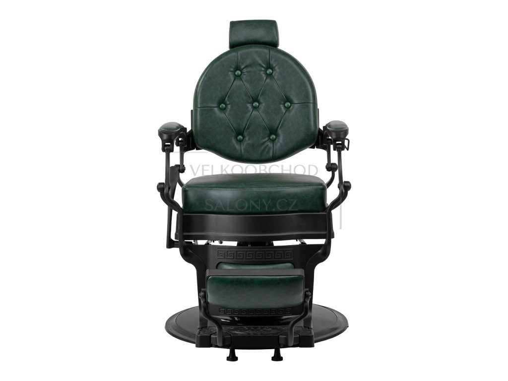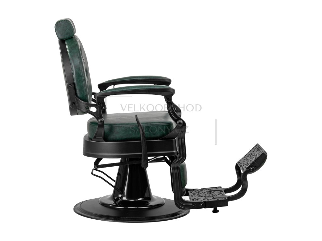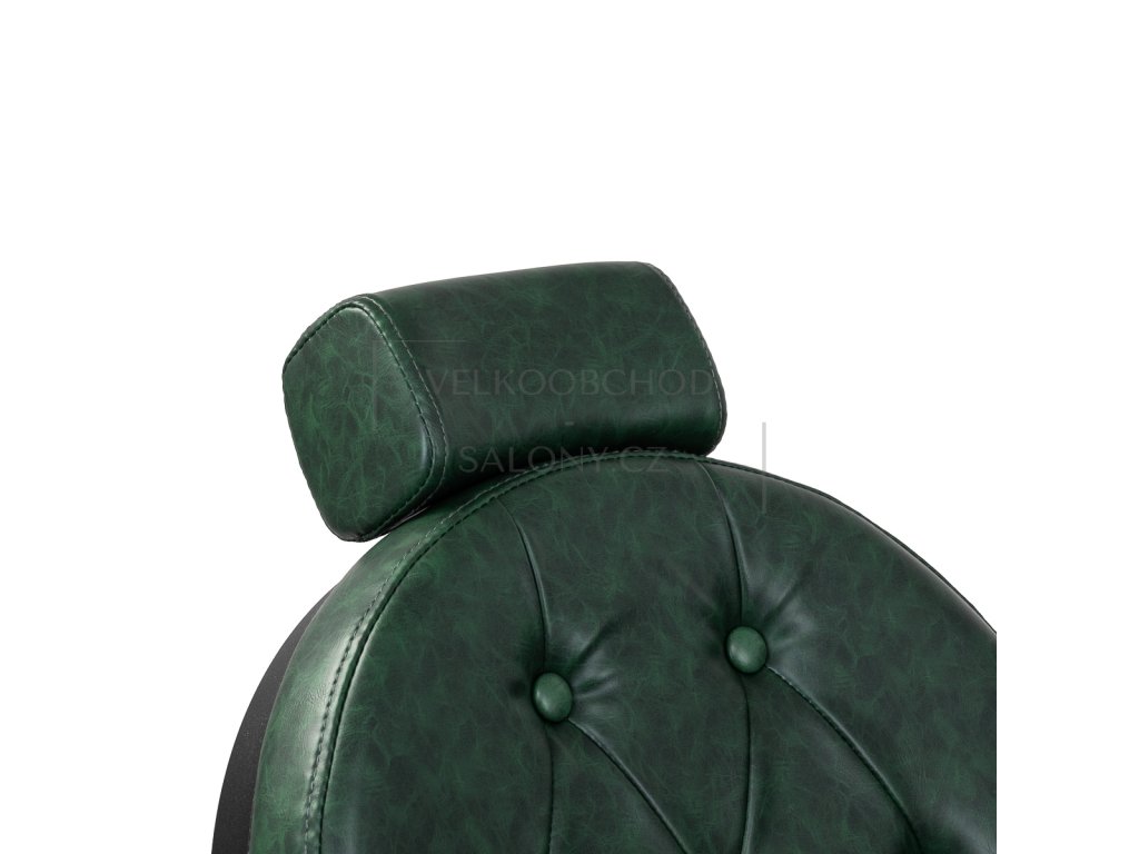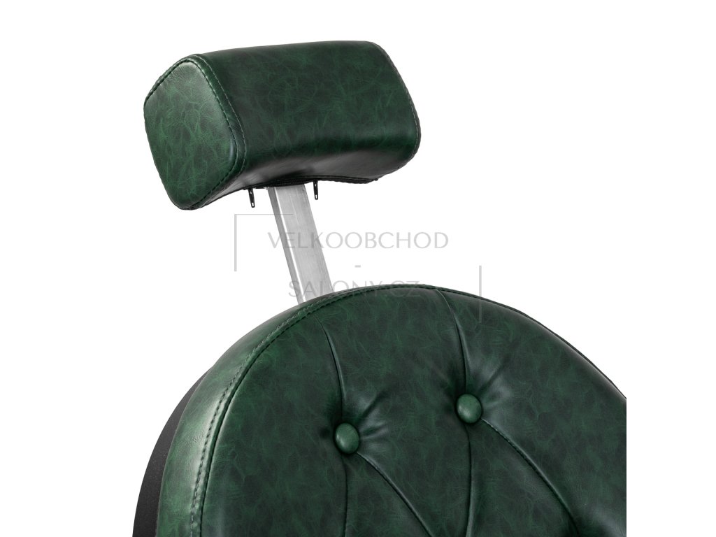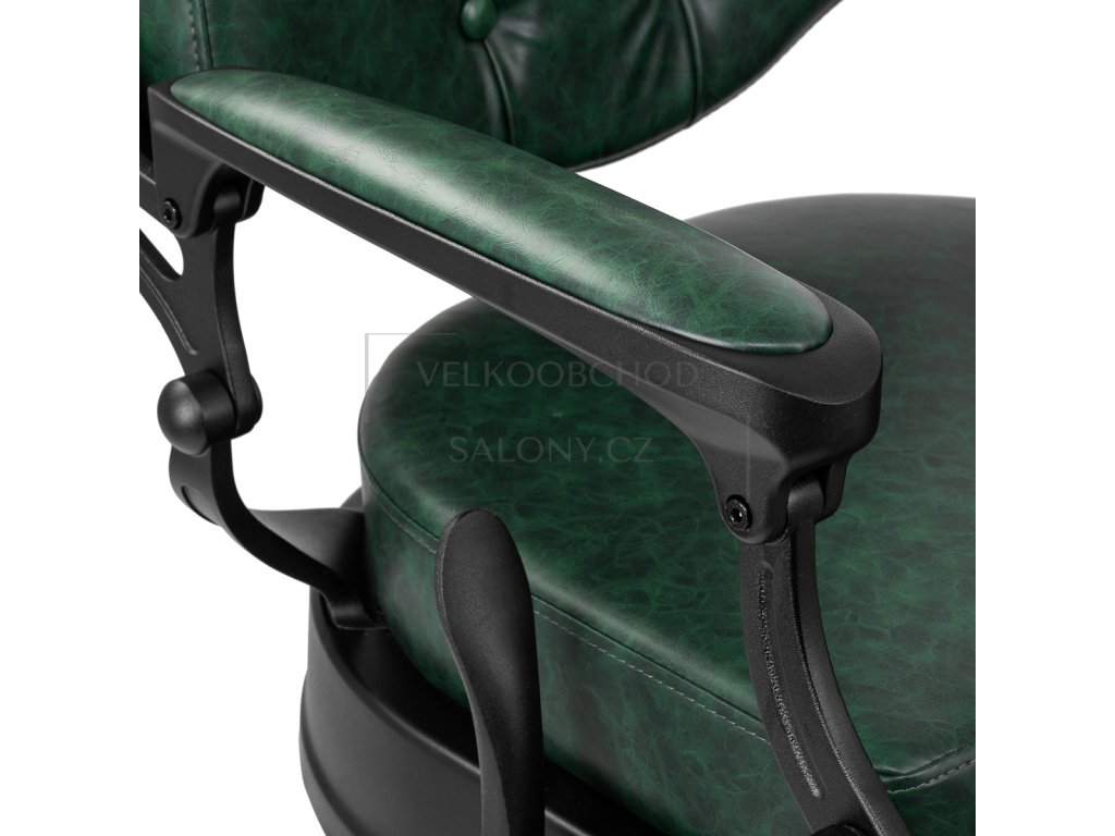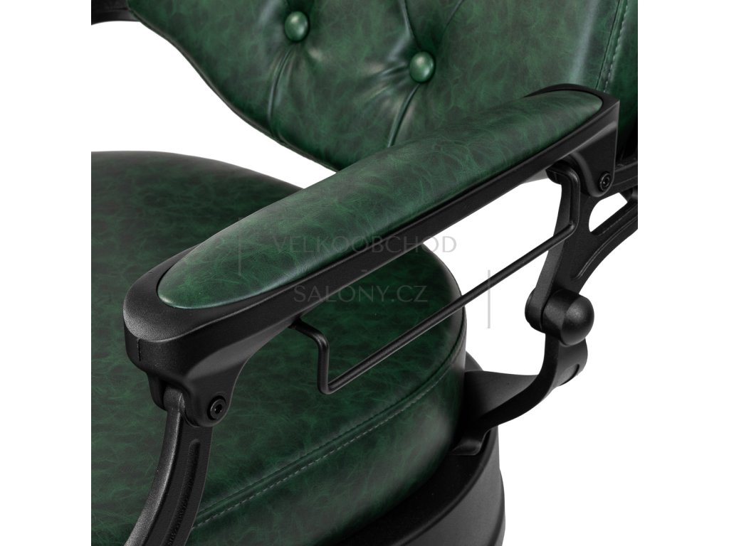 Zelený potah s prošíváním a ozdobnými knoflíky dodává křeslu výrazný vintage charakter, který perfektně doplní atmosféru tradičního barber salonu.