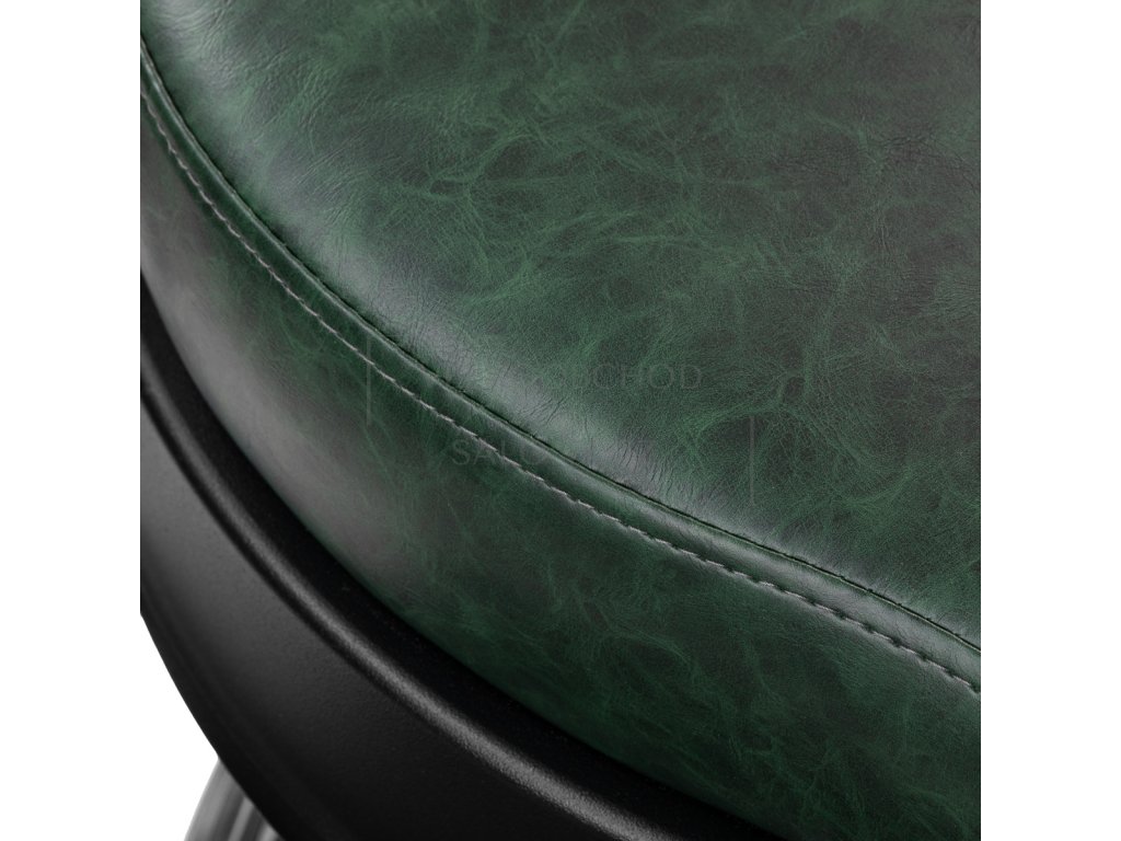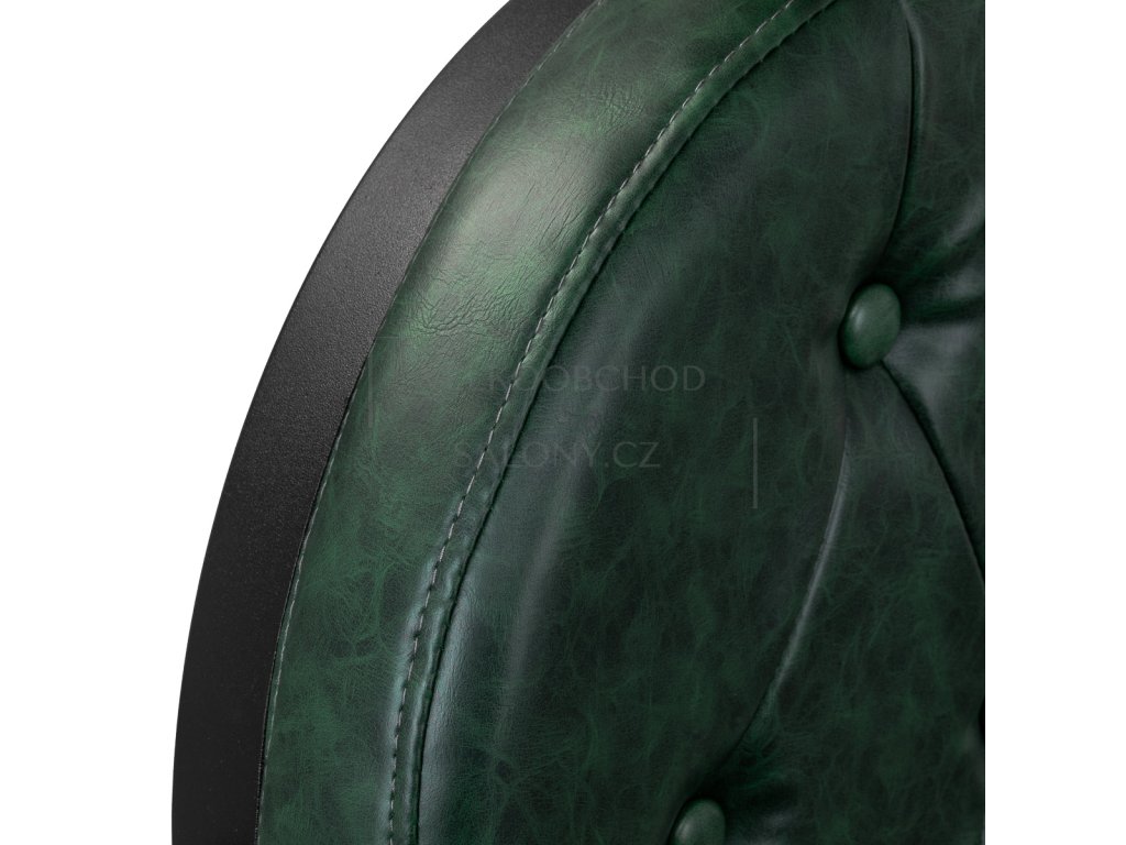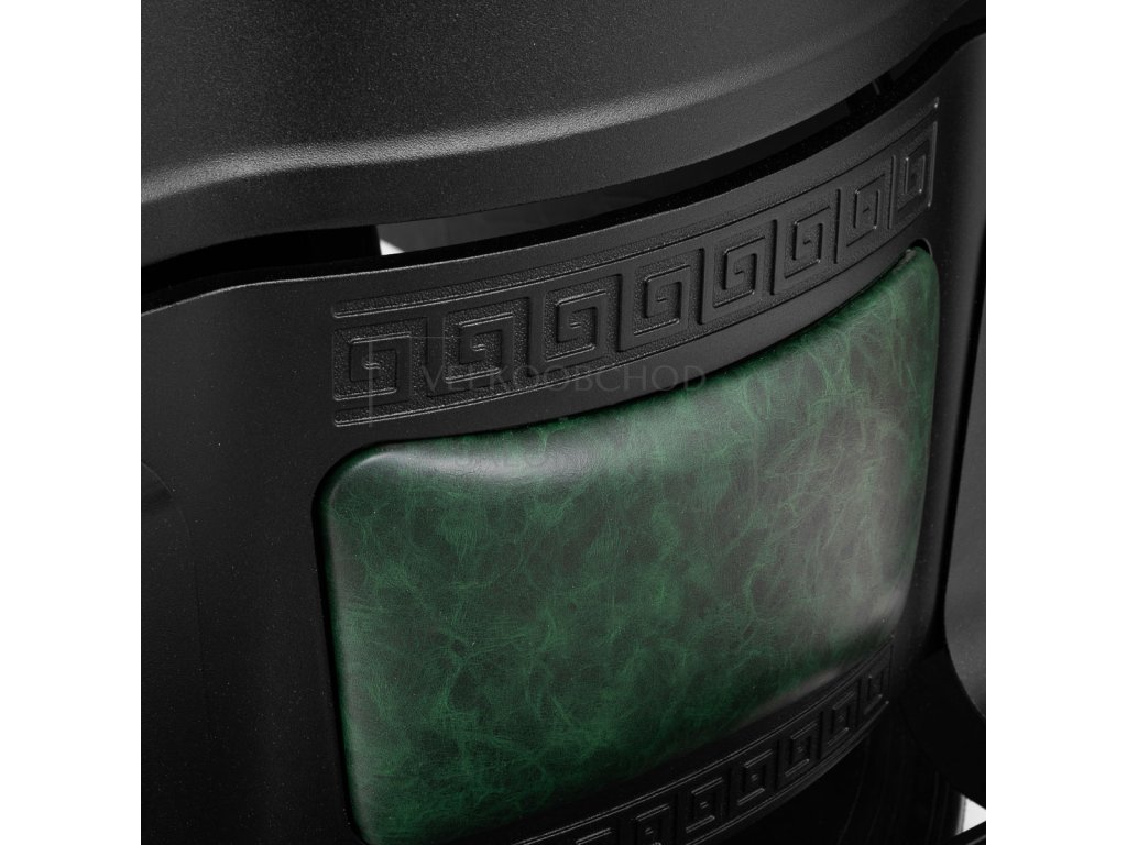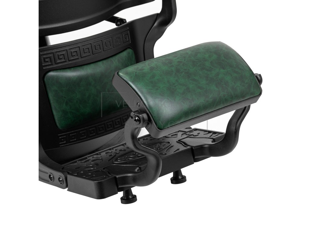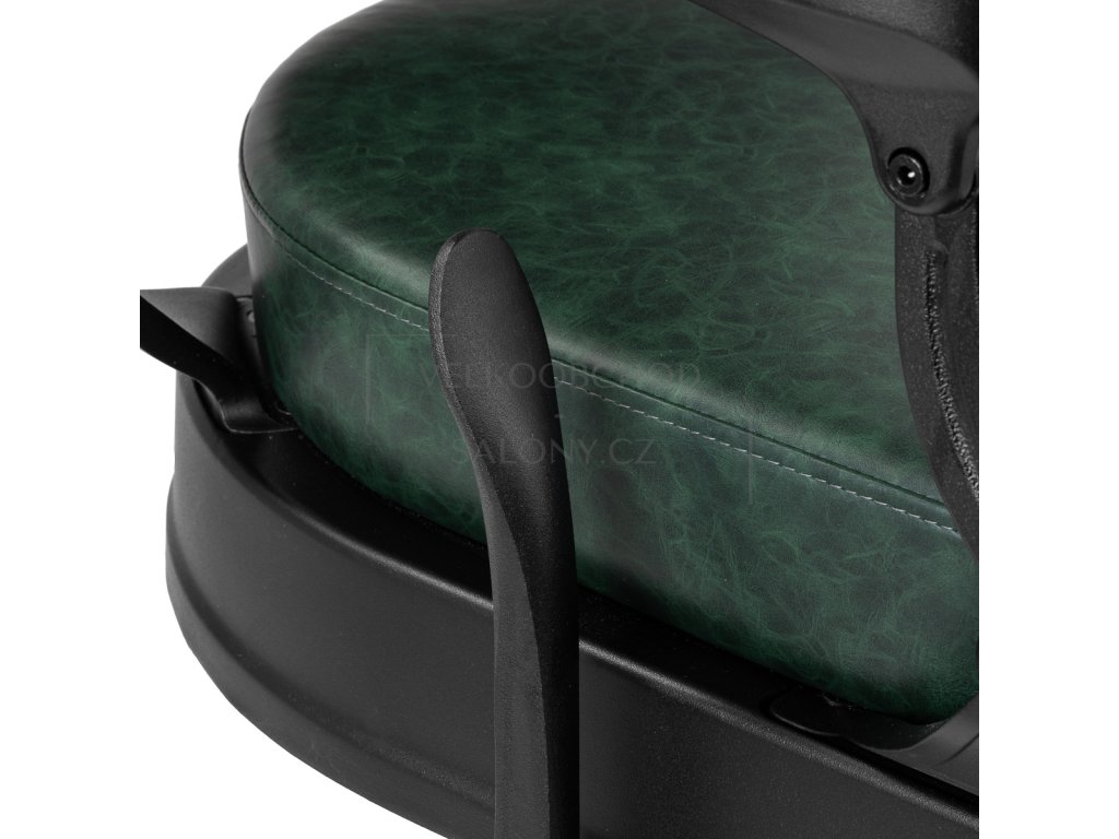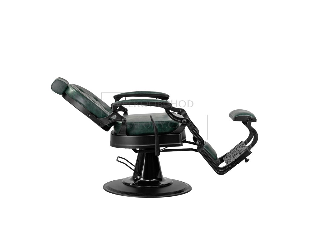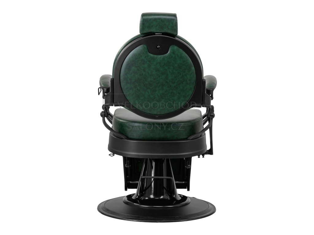 Zelený potah s prošíváním a ozdobnými knoflíky dodává křeslu výrazný vintage charakter, který perfektně doplní atmosféru tradičního barber salonu.