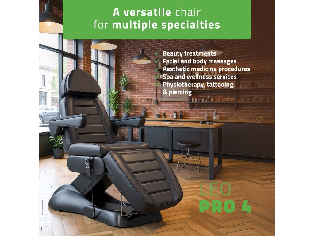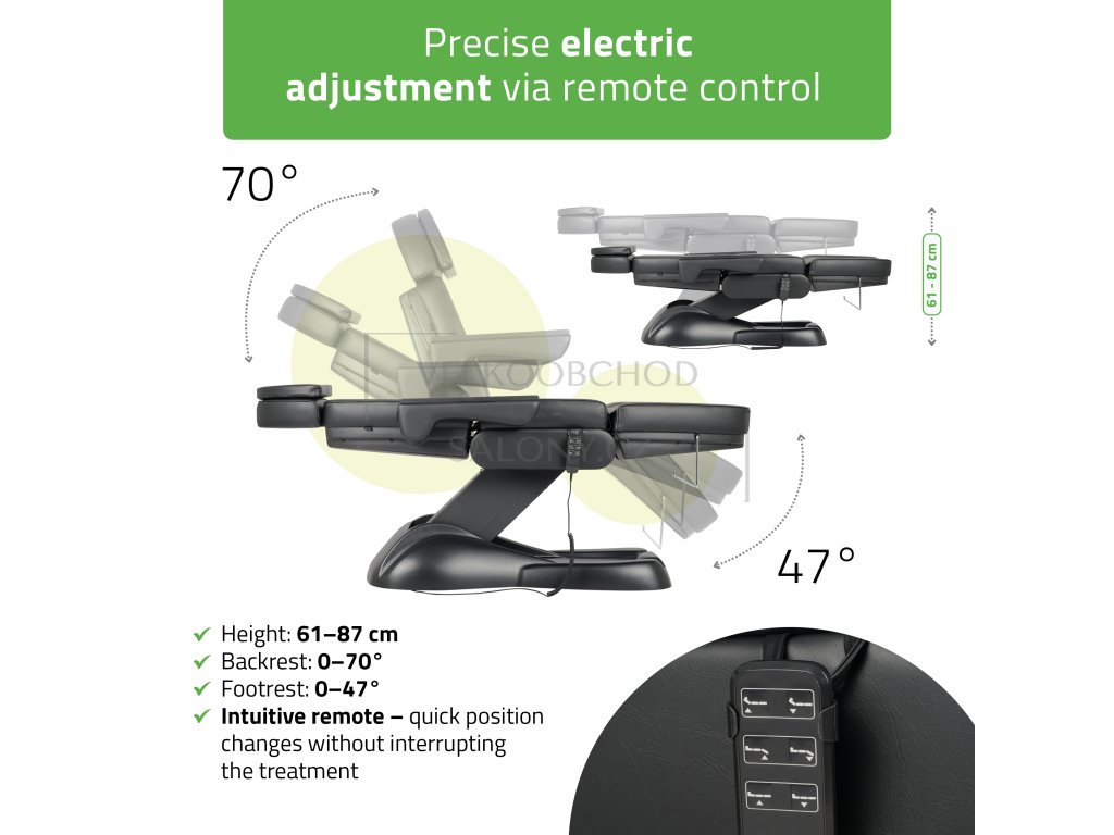 Elektrické kosmetické lehátko Comforma 4 představuje špičkové řešení pro moderní salony, které kladou důraz na ergonomii, komfort a profesionální estetiku. Nabízí tichý elektrický pohon s plynulým nastavením výšky (61–87 cm), sklonu zádové části (0–70°) i nožní opěrky (0–47°) – vše pohodlně ovládané pomocí intuitivního dálkového ovladače, který barevně ladí s čalouněním.