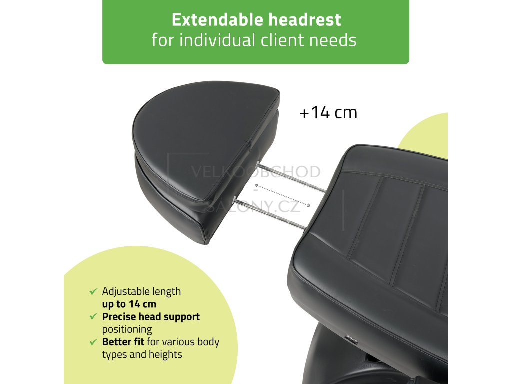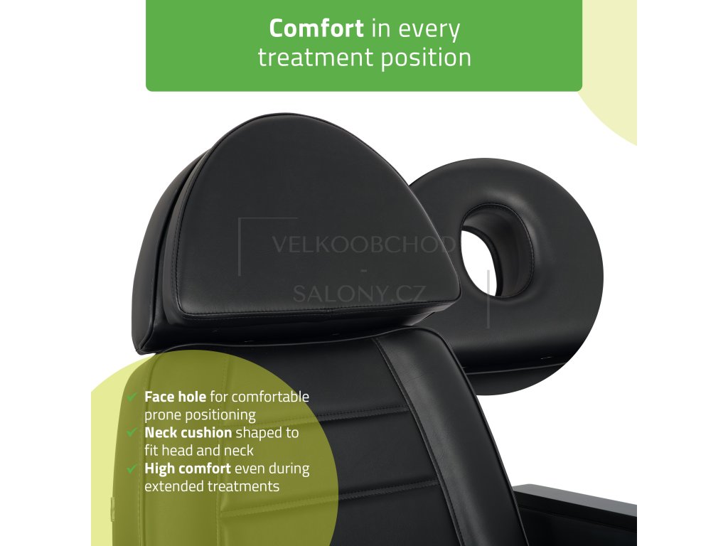 Pro maximální pohodlí klienta je lehátko vybaveno výsuvnou opěrkou hlavy s tvářovým otvorem a doplněno měkkým polštářem, který zajišťuje komfort při ošetřeních vleže i na boku. Sedák z vysoce pružné pěny poskytuje vynikající podporu i při dlouhých procedurách.
