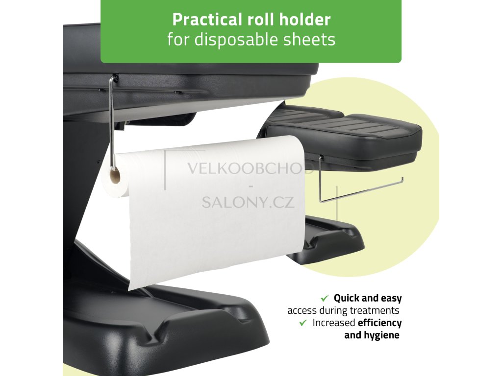 Pevná základna s nosností až 175 kg zajišťuje stabilitu i při náročném provozu. Integrovaný držák na papírovou roli podporuje hygienu a efektivní práci.