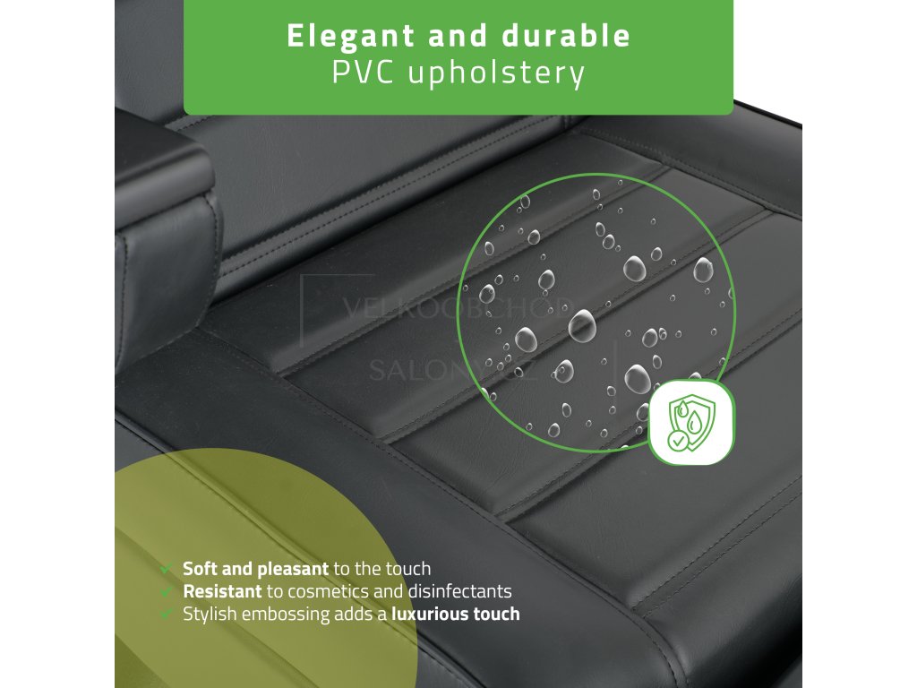 Područky jsou otočné o 180° a plně odnímatelné, čímž se přizpůsobí jak klientům, tak terapeutům. Čalounění z kvalitního PVC je odolné a snadno se čistí. Stylový design doplňují decentní dřevěné detaily a ozdobné prošití, které dělají z lehátka atraktivní prvek interiéru.