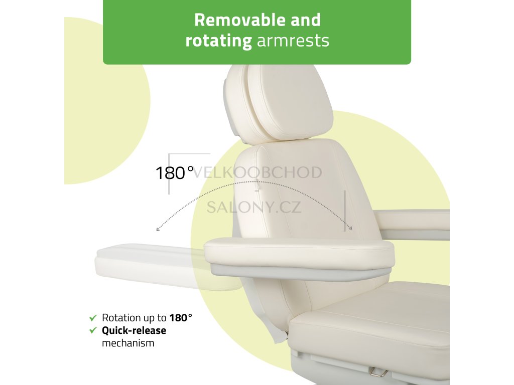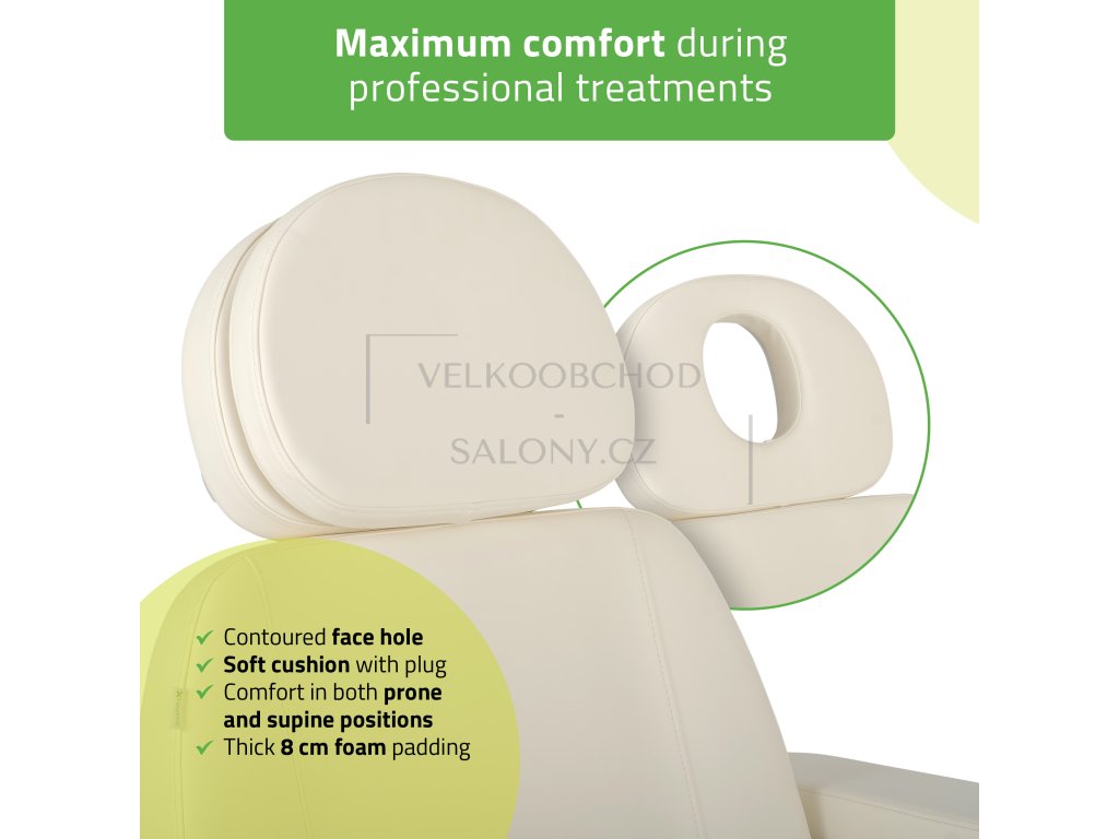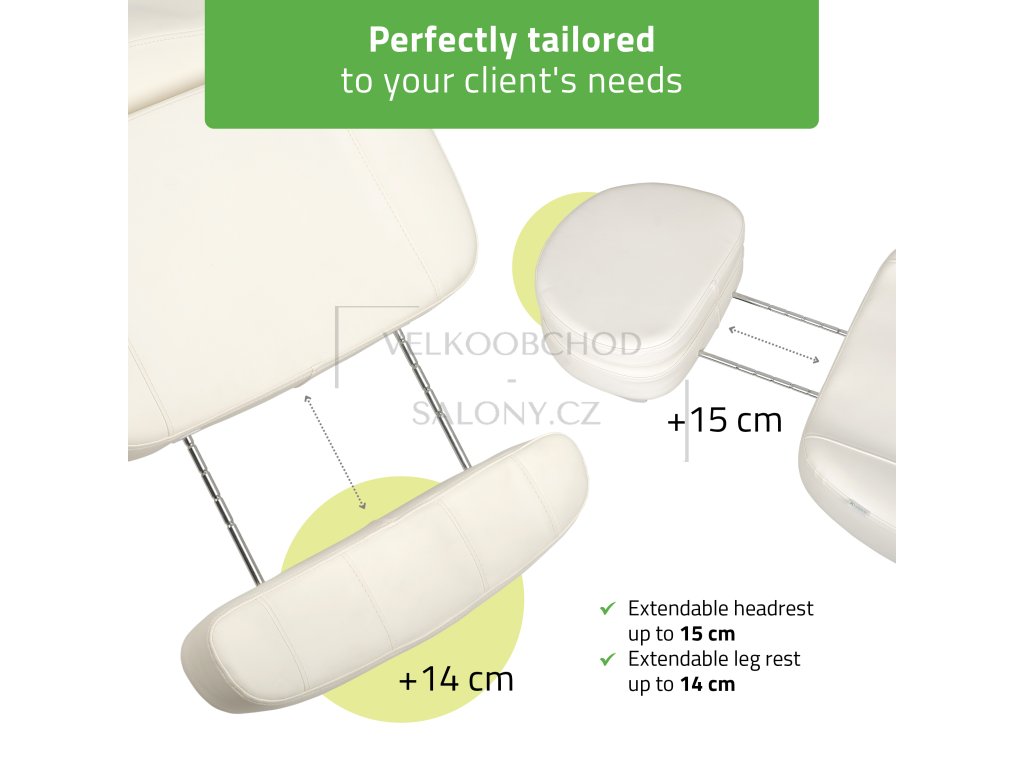 Komfort pro klienta – odnímatelné a otočné područky, otvor na obličej s polštářkem, prodloužitelná opěrka hlavy (o 15 cm) i nohou (o 14 cm).