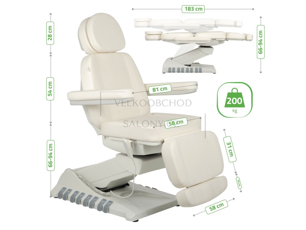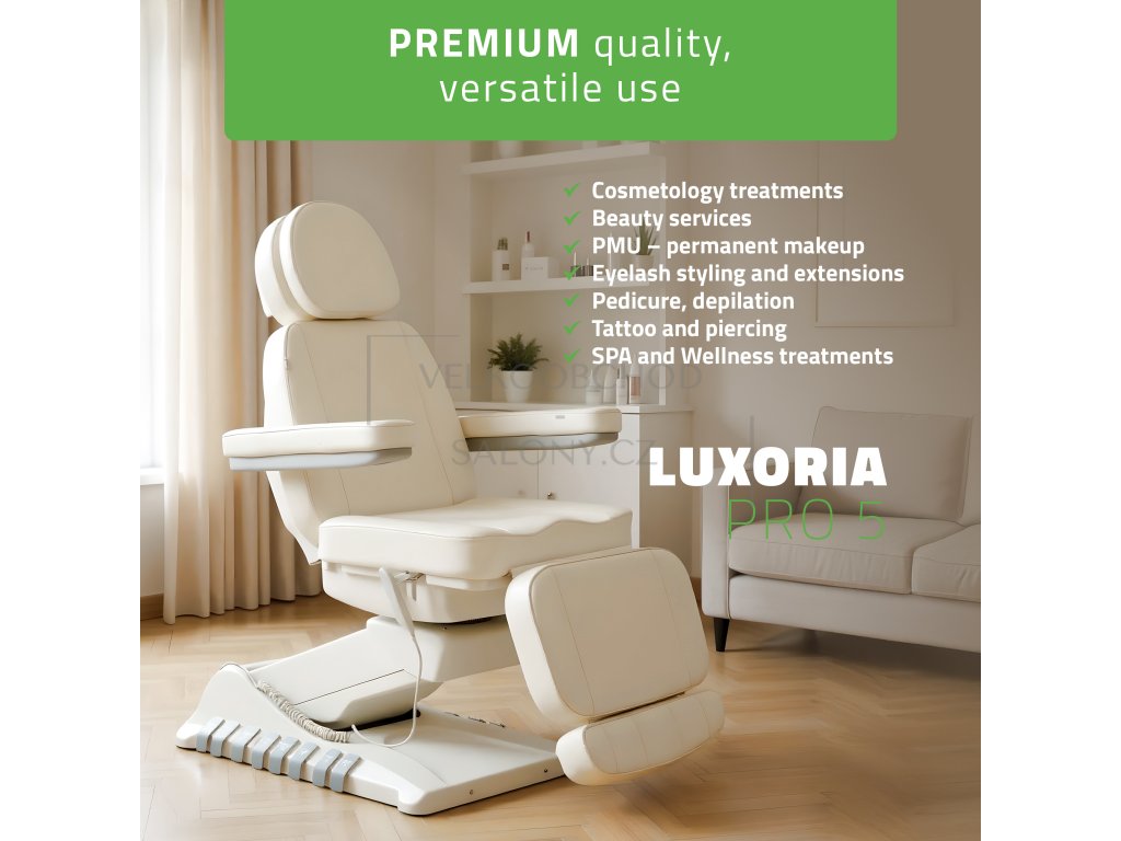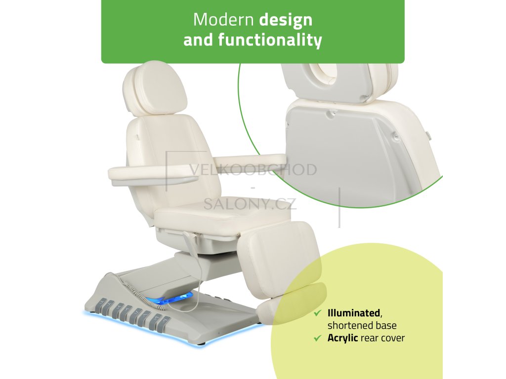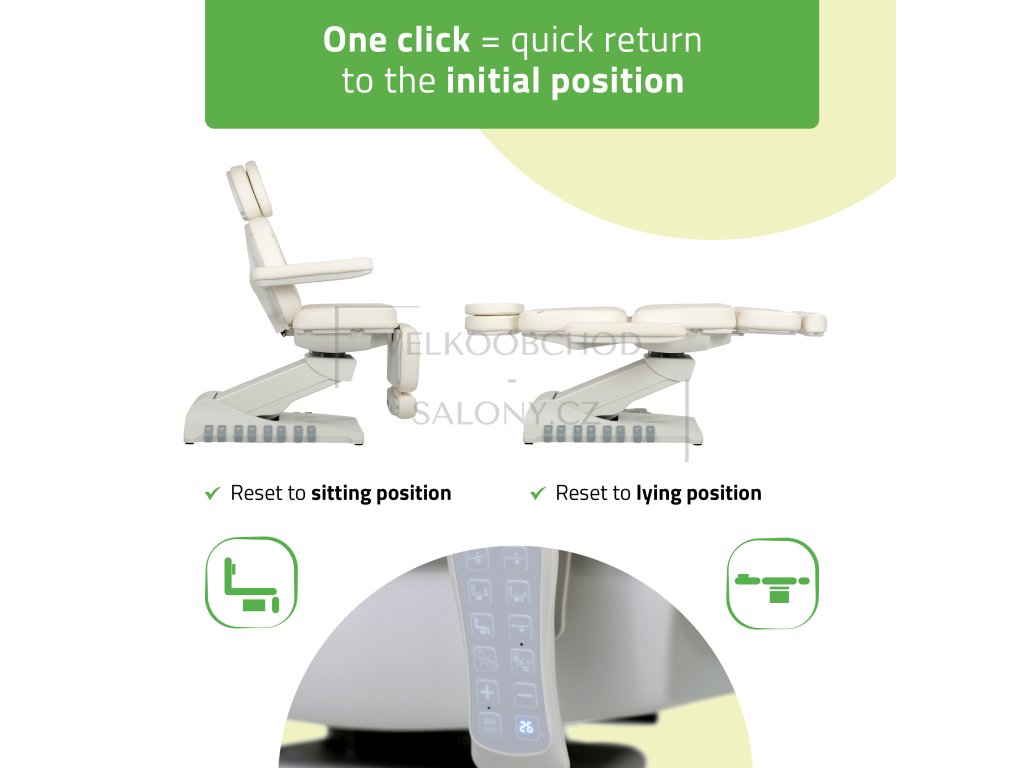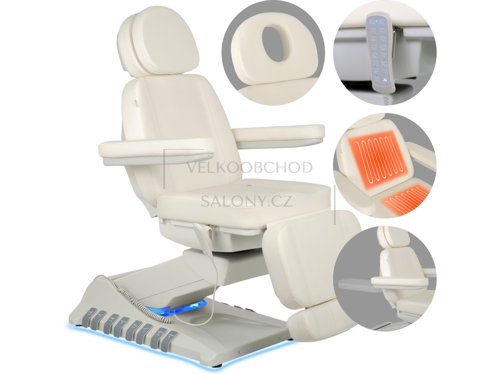 Simply Elegance 5 v bílé barvě je špičkové 5motorové kosmetické křeslo určené pro profesionální využití v salonech krásy, klinikách estetické medicíny a SPA centrech. Díky samostatným motorům umožňuje snadné a plynulé nastavení ve všech potřebných polohách a poskytuje maximální komfort pro klienta i pohodlnou práci pro obsluhu.