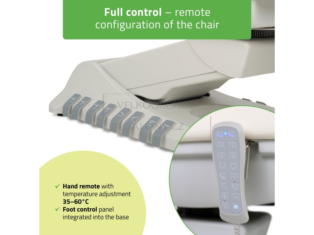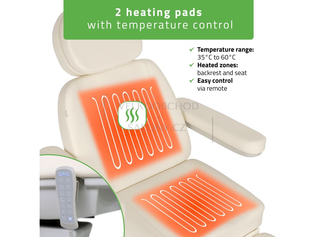Vyhřívání s dálkovým ovladačem – nastavitelná teplota od 35 °C do 60 °C pro maximální komfort během procedur.