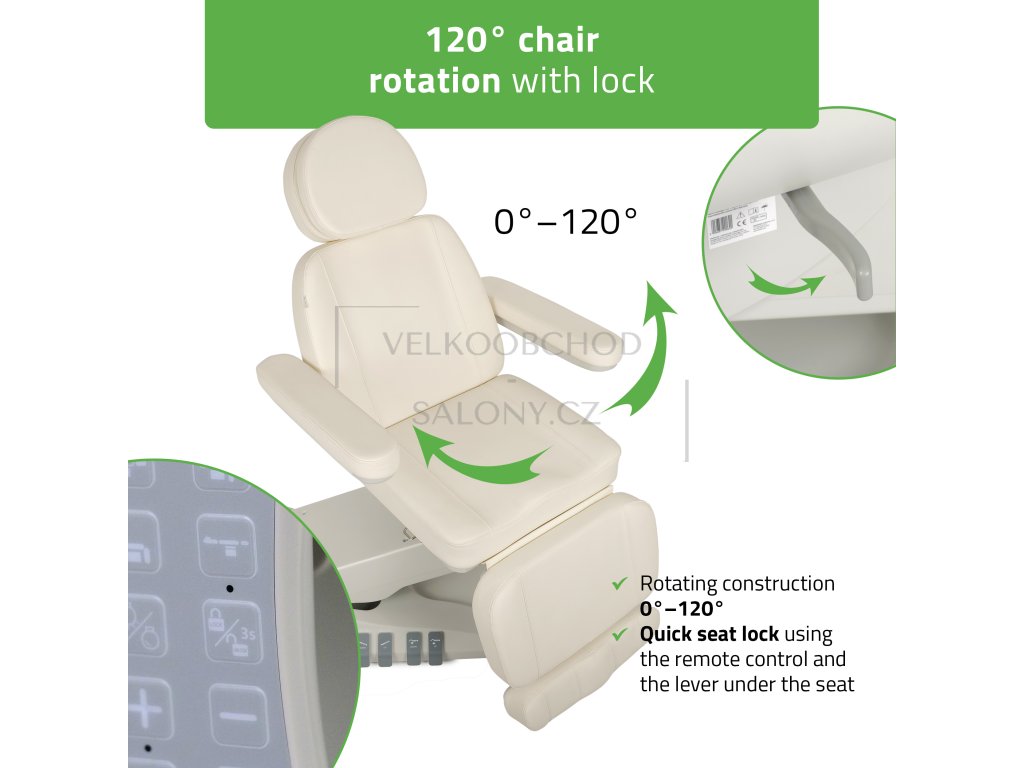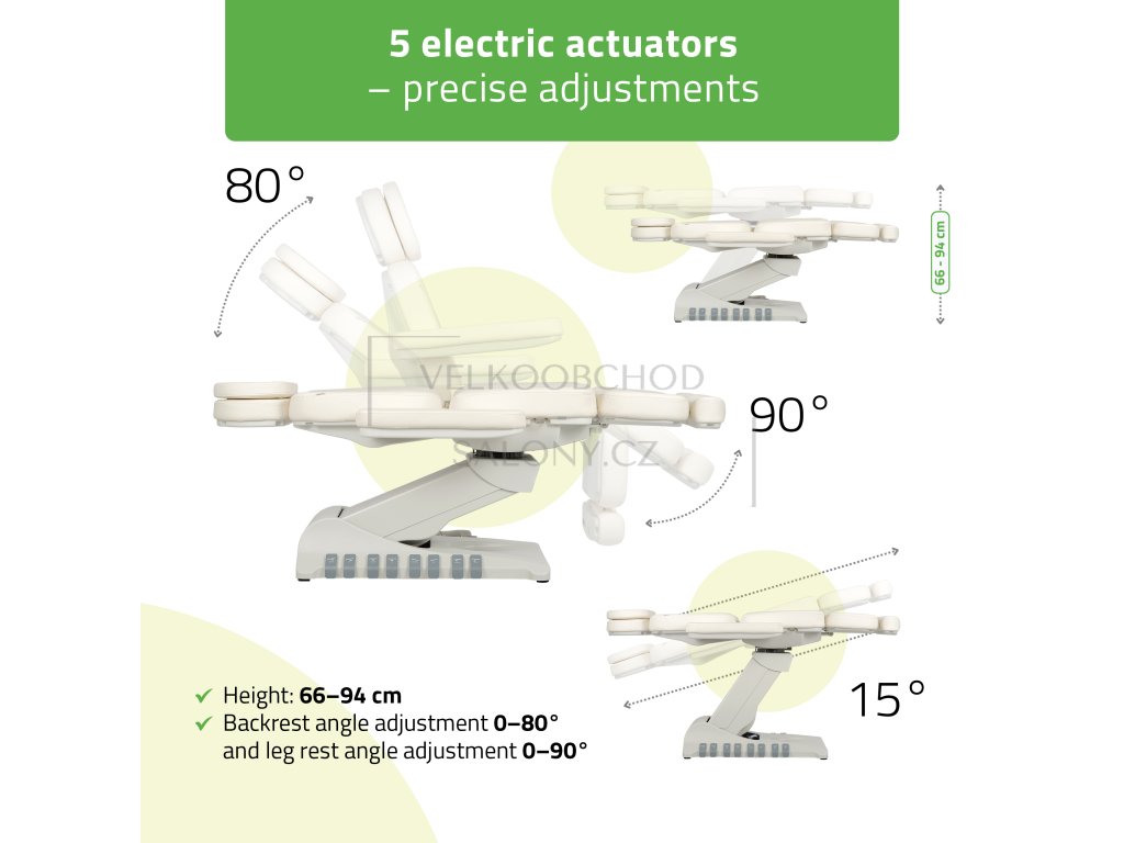5motorové elektrické ovládání – samostatné motory umožňují regulaci výšky (60–90 cm), úhlu opěradla (0–80°), nožní části (0–90°), náklonu celého křesla a otočné základny s rozsahem 120°.