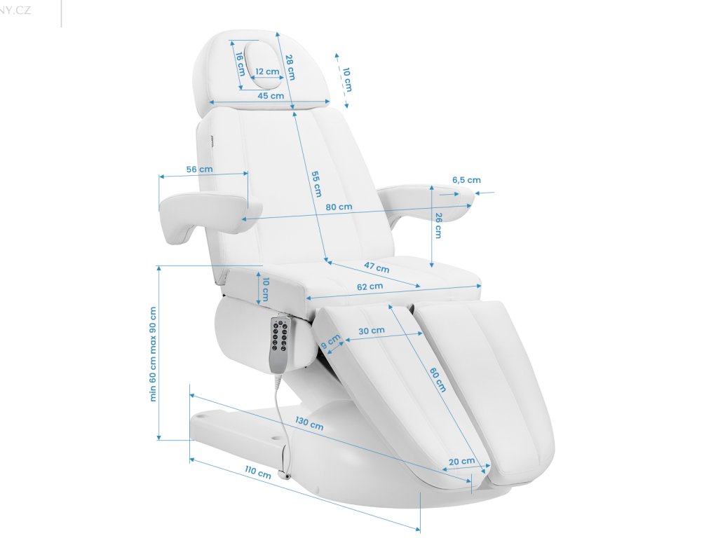 Robustní konstrukce s nosností až 150 kg zaručuje vysokou stabilitu a dlouhou životnost i při každodenním používání. V plně rozložené poloze dosahuje křeslo délky přibližně 200 cm, takže poskytuje komfortní podporu celého těla – ideální pro procedury v ležící poloze.