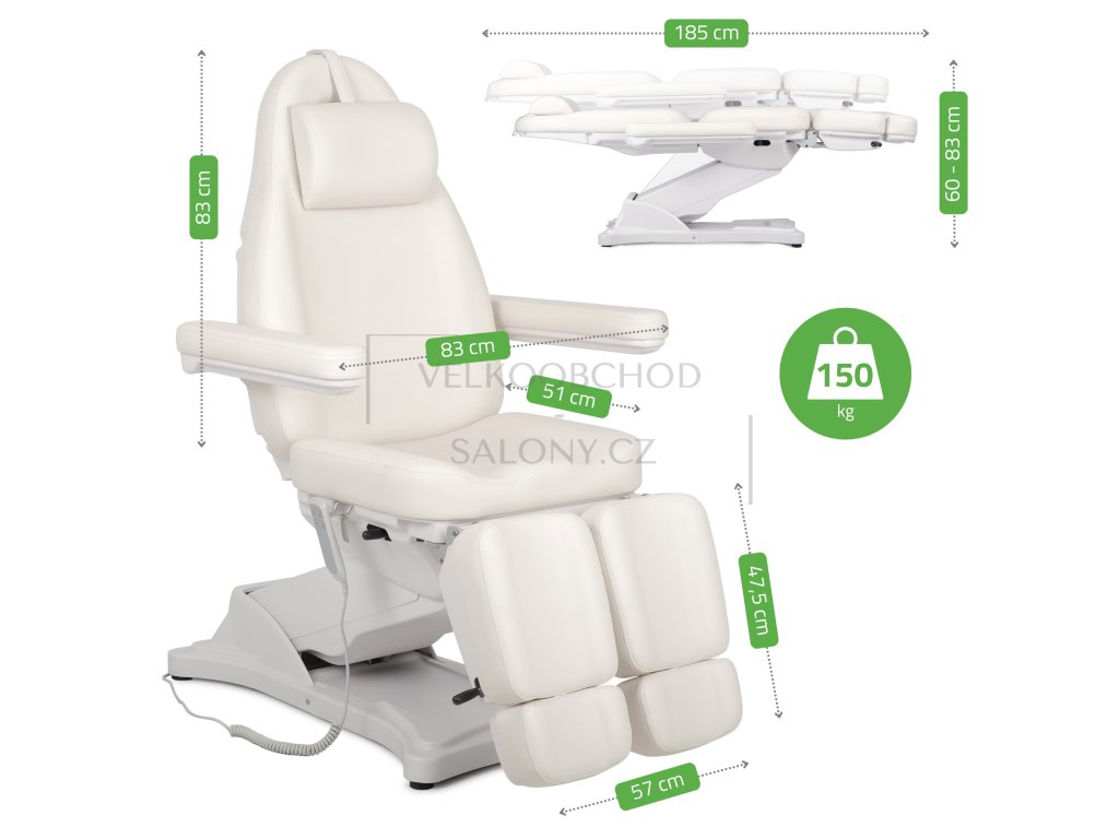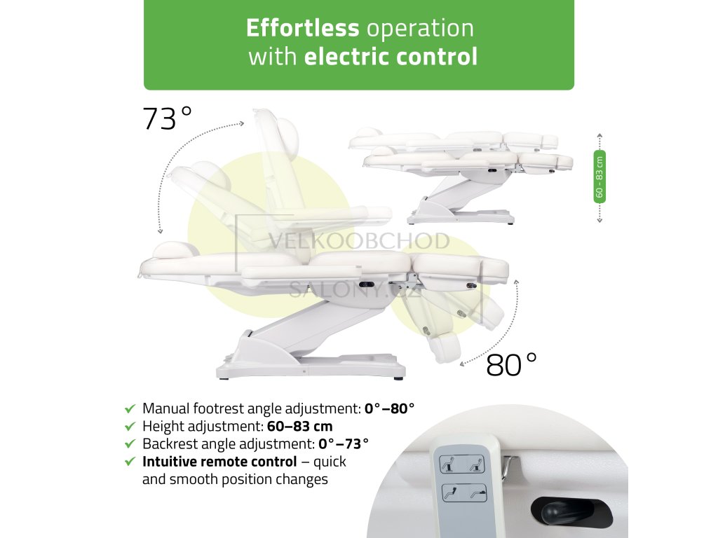 Díky elektrickému nastavení výšky (60–83 cm) a sklonu opěradla (0–73°) lze křeslo snadno přizpůsobit potřebám různých procedur. Úhel nožní části lze nastavit manuálně (0°–80°), což zajišťuje optimální polohu nohou klienta. Lehací poloha s obličejovým otvorem a ergonomickým polštářem pod krk nabízí komfort i při dlouhých ošetřeních vleže na břiše.