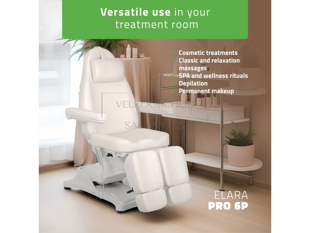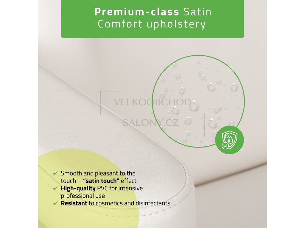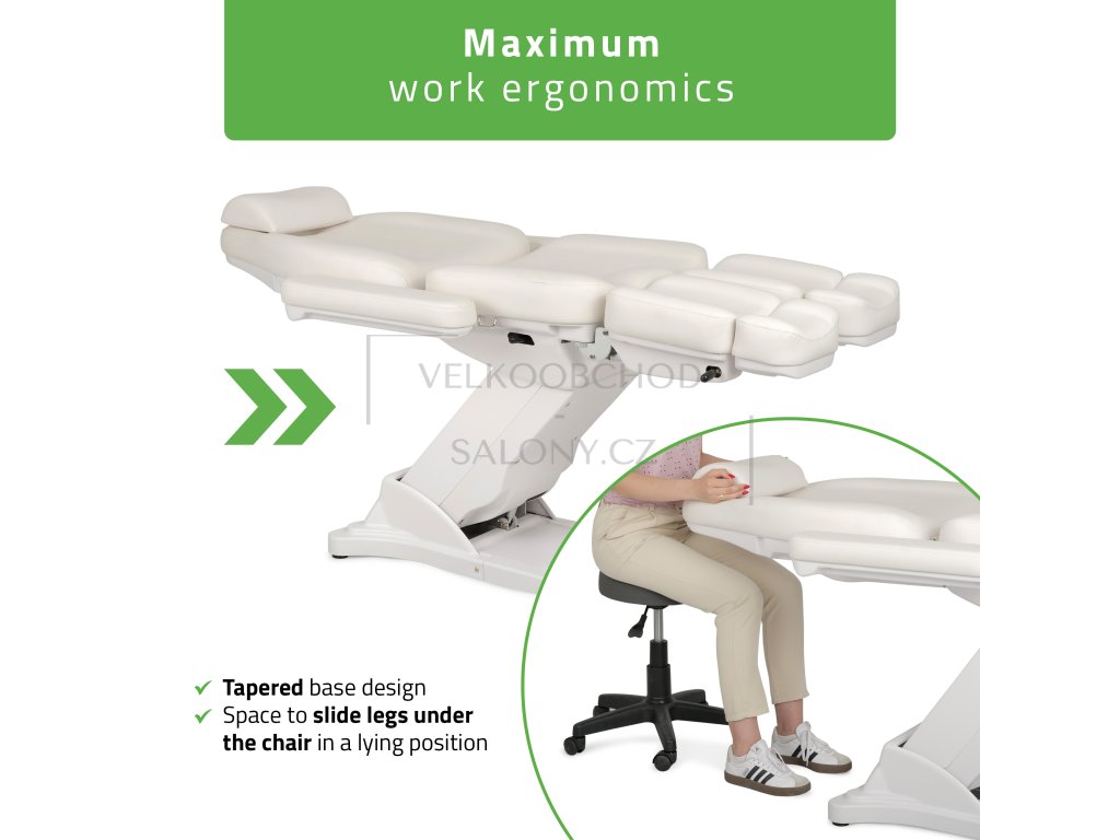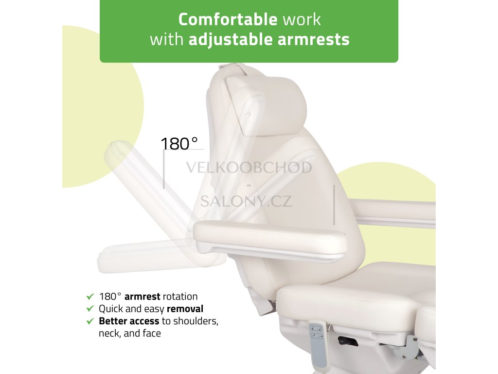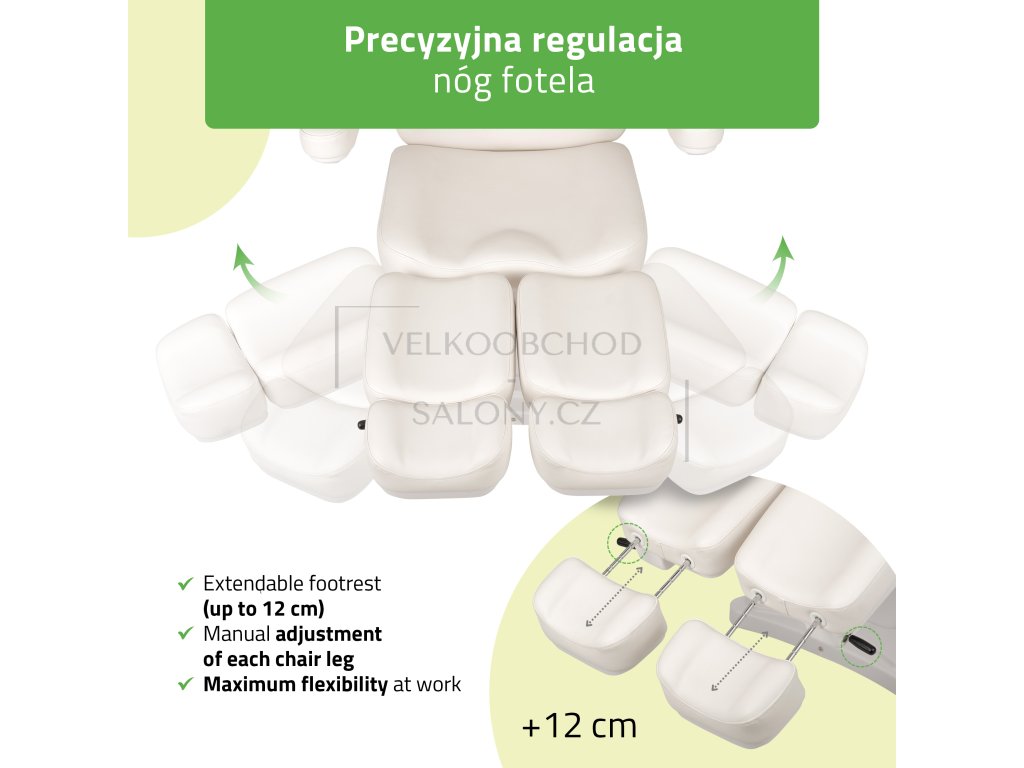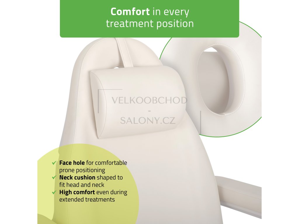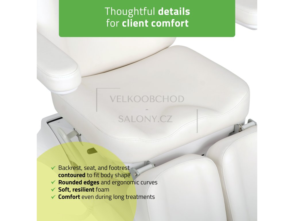 Ergonomicky tvarované polštáře se zaoblenými hranami poskytují stabilní oporu a příjemné sezení i ležení. Odnímatelné područky s možností otáčení o 180° umožňují flexibilní nastavení pro různé typy procedur. Vysouvatelná opěrka nohou (až o 12 cm) pomáhá přizpůsobit délku křesla individuálně podle výšky klienta.
