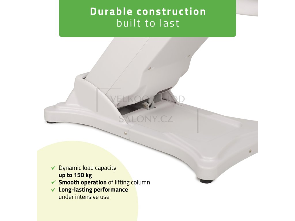 Každou nohu křesla lze nastavit samostatně, což poskytuje maximální přesnost při polohování. Zúžená základna umožňuje snadný přístup k hlavové části a pohodlné umístění nohou terapeuta pod konstrukci. Pevná a stabilní konstrukce s nosností až 150 kg je navržena pro intenzivní každodenní provoz.