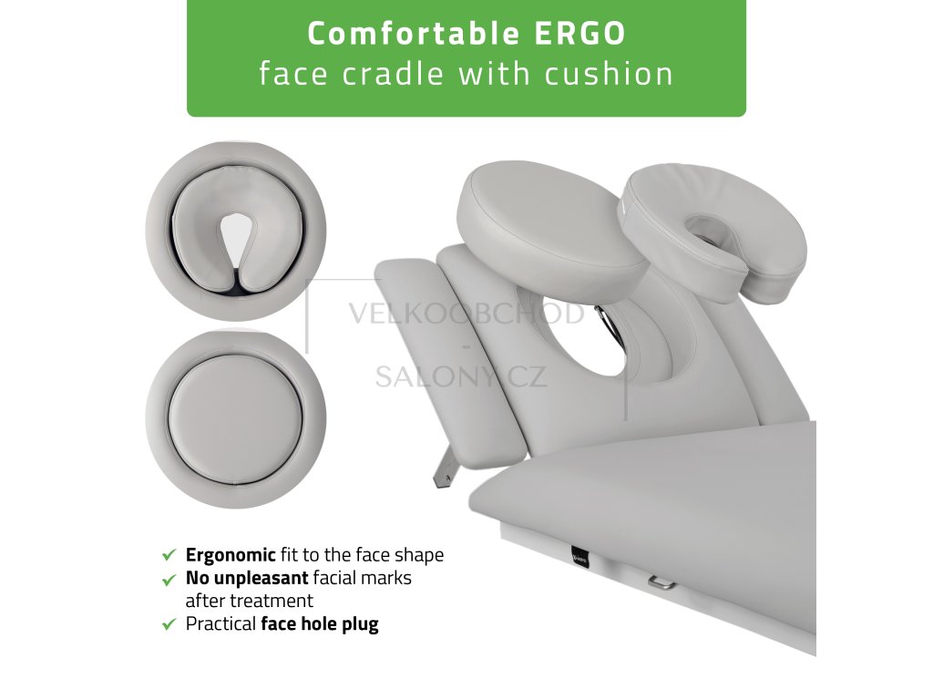 Středová část lehátka umožňuje nastavení úhlu v rozmezí 0°–25°, což usnadňuje správné polohování při práci s bederní a pánevní oblastí. Ergonomický polštář ERGO s otvorem na obličej a záslepkou poskytuje výjimečné pohodlí i při delších procedurách a umožňuje snadnou změnu polohy klienta.