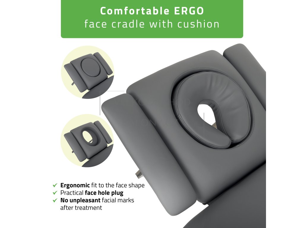 Středová část je vybavena nastavitelným lomem v úhlu 0°–25°, který zajišťuje ideální podporu při terapiích zaměřených na bederní a pánevní oblast. Ergonomický polštář ERGO s otvorem na obličej zaručuje pohodlí i při delších ošetřeních a je doplněn záslepkou pro snadnou úpravu polohy.