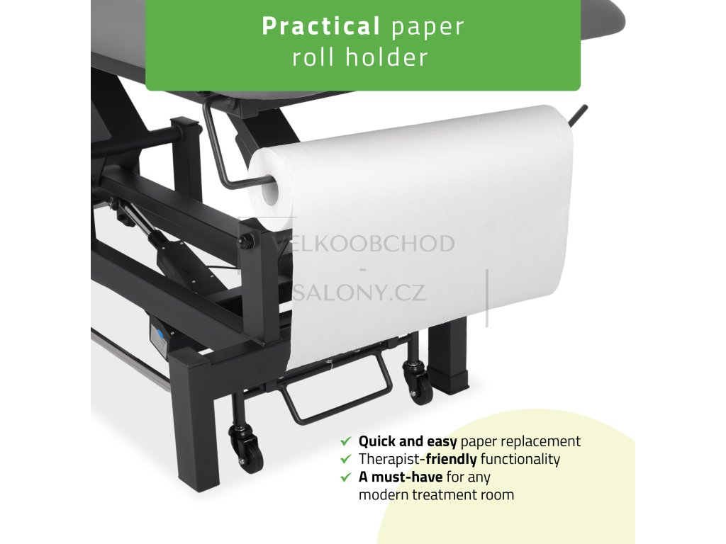 Integrovaný systém koleček s aretací usnadňuje manipulaci v prostoru. Součástí je také držák na papírové role, který usnadňuje udržování hygieny při každém ošetření.