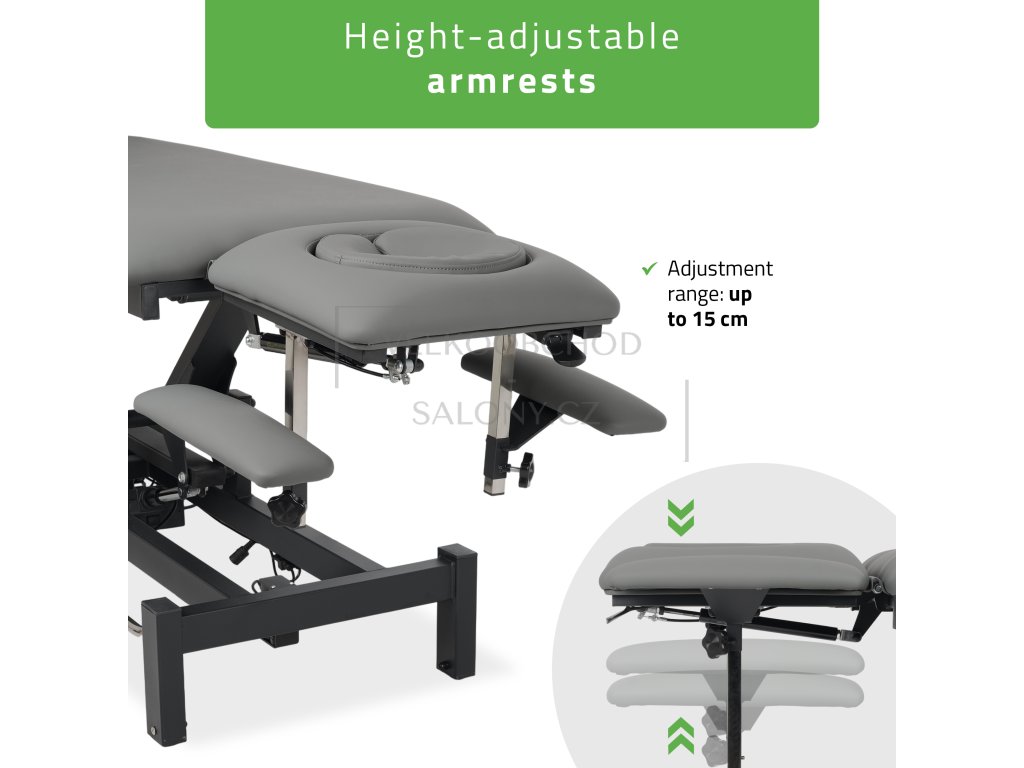 Lehátko je vybaveno elektrickým nastavením výšky v rozmezí 49–86 cm. Výšku lze měnit pomocí nožní ovládací lišty po obvodu nebo ručního ovladače s bezpečnostní funkcí zámku. Díky tomu lze polohu přizpůsobit během ošetření bez přerušení kontaktu s klientem.