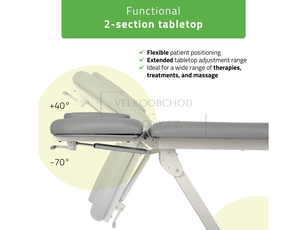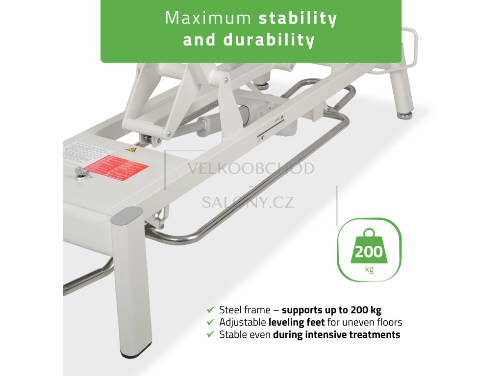 Díky promyšlené ergonomii, plynulému elektrickému zdvihu a komfortnímu 2dílnému ležícímu povrchu poskytuje maximální pohodlí pro klienta a zároveň ideální pracovní podmínky pro terapeuta.