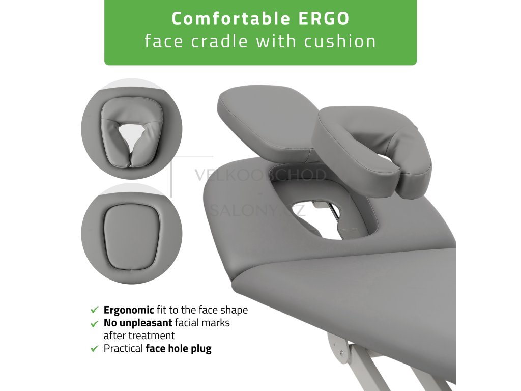 Nastavitelná opěrka hlavy s výřezem na obličej a anatomicky tvarovaným ERGO polštářem zajišťuje pohodlí při terapiích vleže na zádech i na břiše. Plynová pružina umožňuje plynulé polohování v rozmezí od -70° do +40°.