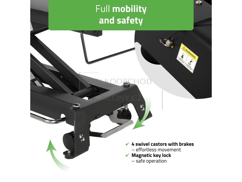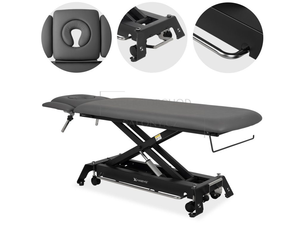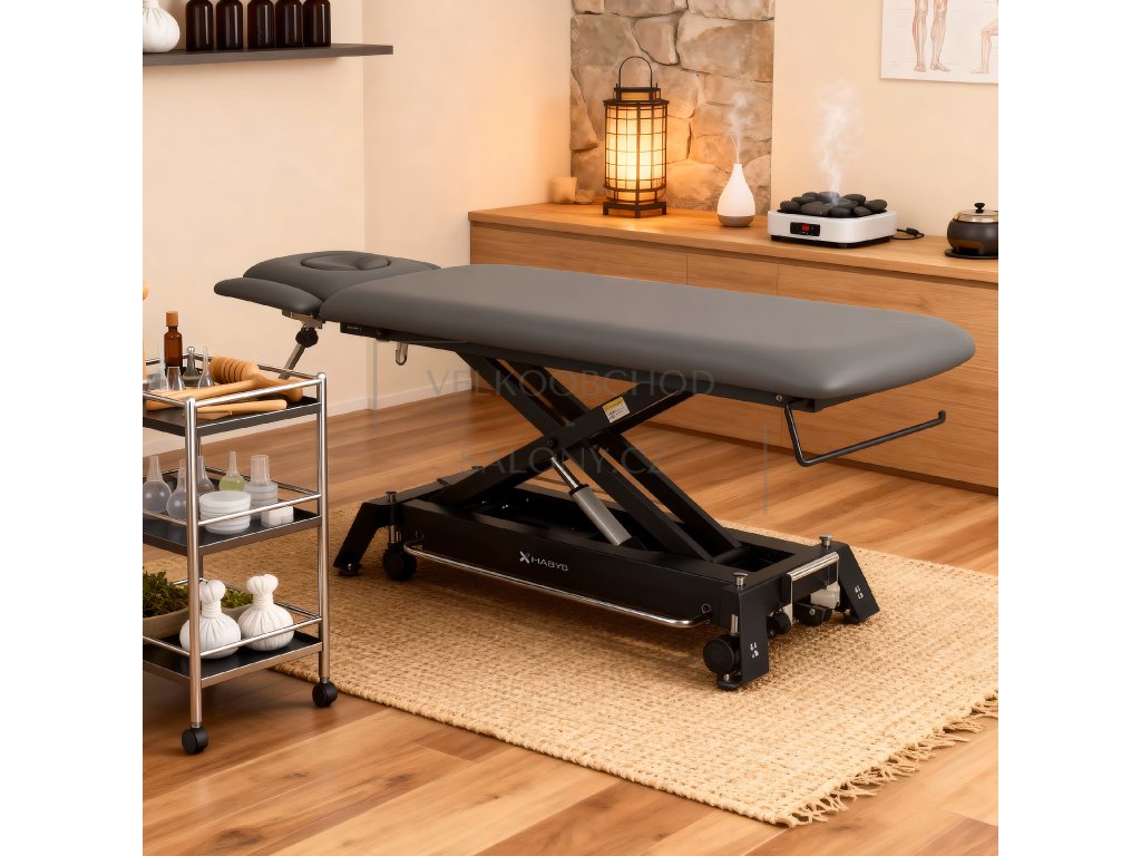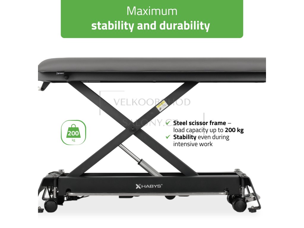 Ocelová nůžková základna poskytuje vysokou stabilitu při práci. Nosnost 200 kg umožňuje bezpečné použití i u klientů s vyšší hmotností nebo při technikách vyžadujících silnější tlak.