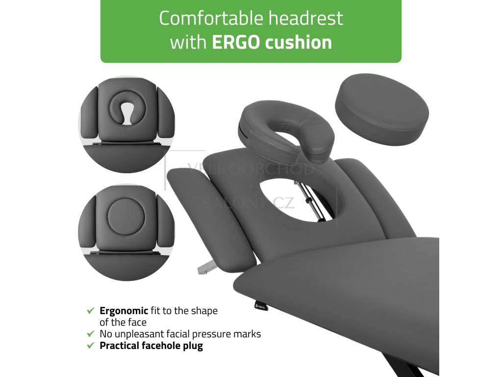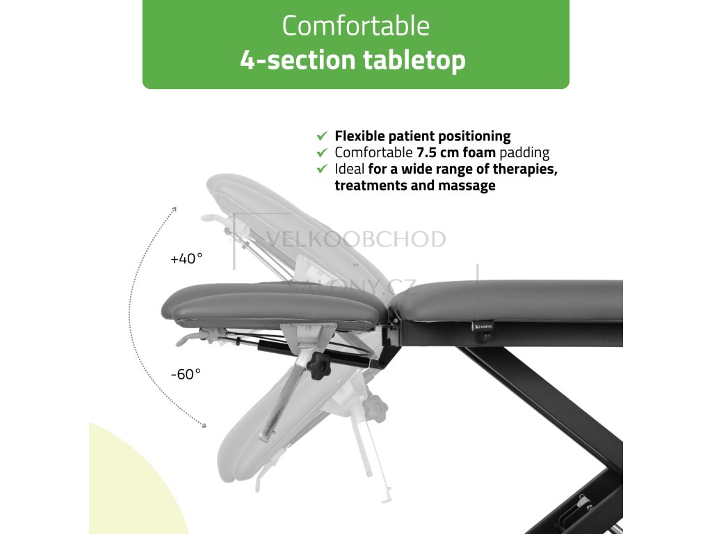Hlavová sekce je vybavena otvorem na obličej a ergonomickým polštářem, díky čemuž nabízí komfort v poloze na břiše i na zádech. Rozsah nastavení –60° až +40° zvyšuje univerzálnost při různých terapeutických postupech.