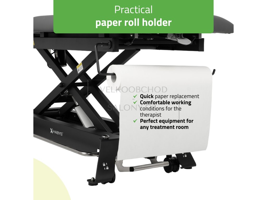 Lehátko je vybaveno čtyřmi kolečky s brzdou, což usnadňuje přesun po místnosti. Držák papírové role (do šíře 60 cm) umožňuje rychlou přípravu lůžka před každým ošetřením.