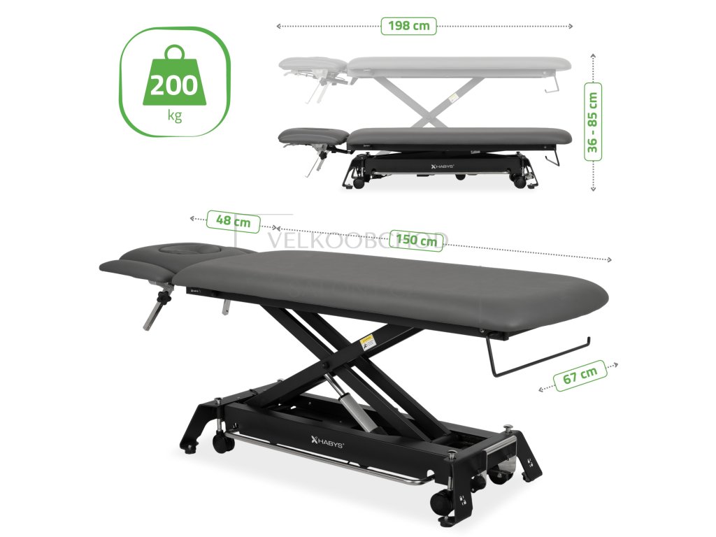 Výškový rozsah 36–85 cm umožňuje bezpečný nástup klienta i ergonomickou práci terapeuta. Nastavení je tiché, plynulé a rychlé, což šetří čas i fyzickou námahu.