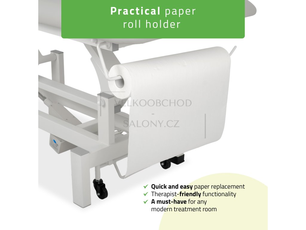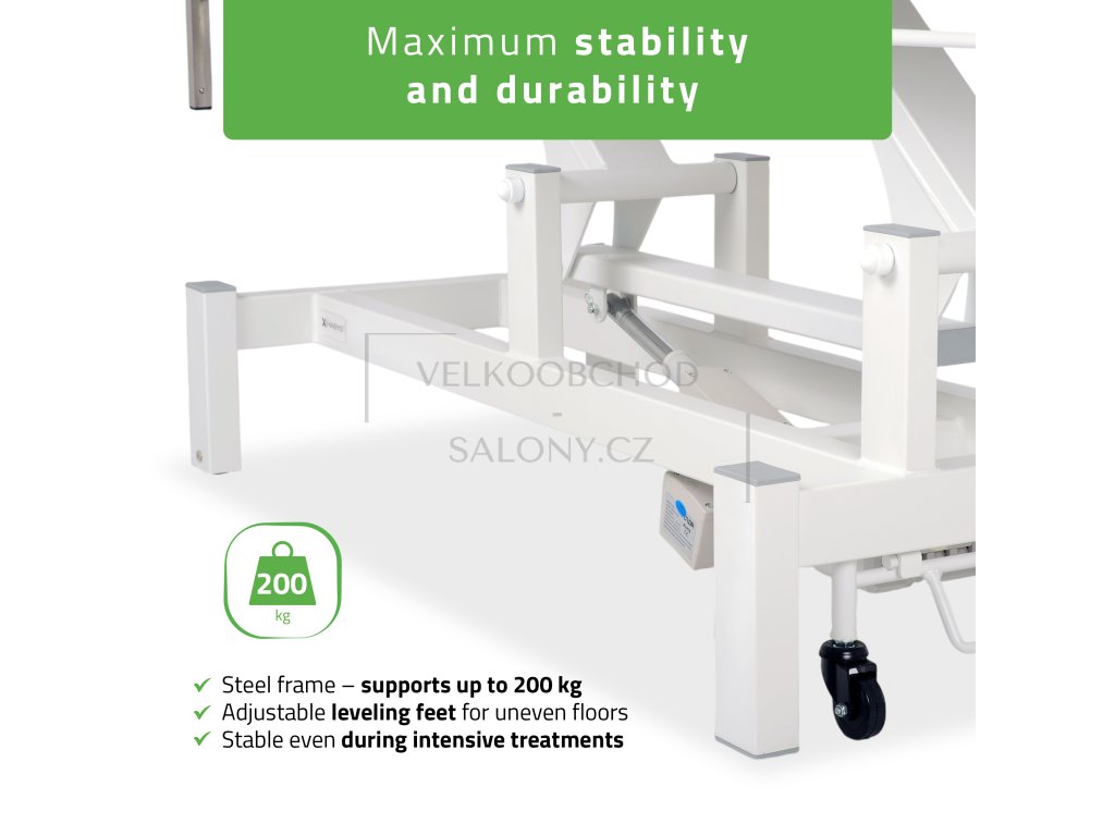 Lehátko nabízí tichý elektrický zdvih ovládaný ručním ovladačem s blokací, ergonomický hlavový díl s plynovou pružinou a ERGO polštářem pro maximální pohodlí. Čtyřdílná ložná plocha s nastavitelnými segmenty a odnímatelnou záslepkou otvoru na obličej zajišťuje široké možnosti polohování.