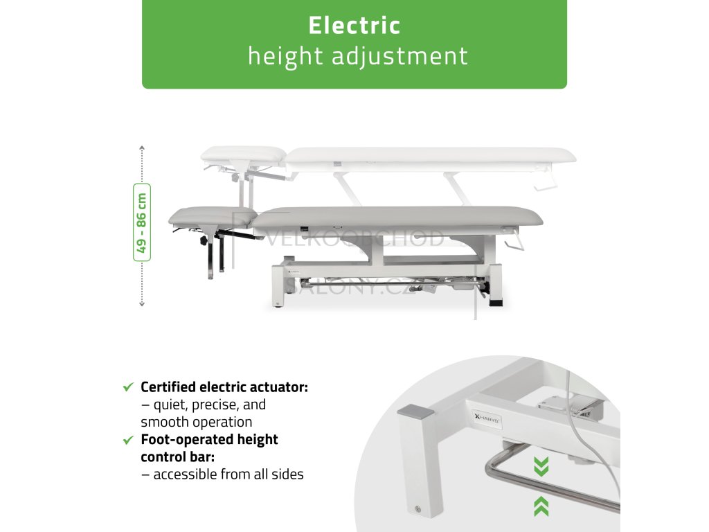 Lehátko je vybaveno tichým elektrickým zdvihem v rozsahu 49–86 cm, který lze pohodlně ovládat ručním ovladačem s blokací nebo nožním rámem umístěným po obou stranách konstrukce. To umožňuje plynulé a bezpečné nastavení výšky bez přerušení terapie.