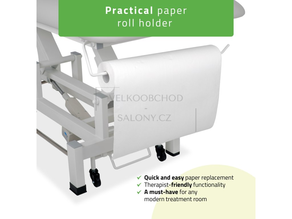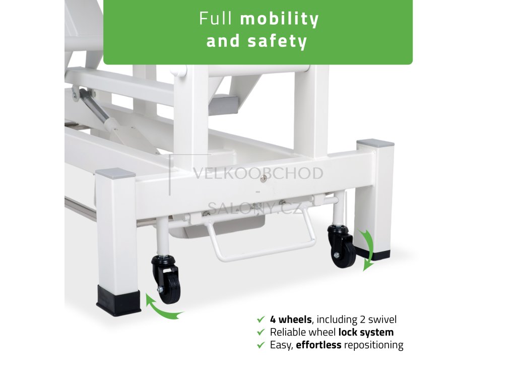 Stabilní ocelová konstrukce s nosností až 200 kg garantuje bezpečnost a dlouhou životnost. Mobilní systém se čtyřmi kolečky, z nichž dvě jsou otočná, umožňuje snadné přemístění lehátka. Praktickým doplňkem je držák hygienického papíru, který usnadňuje každodenní provoz.
