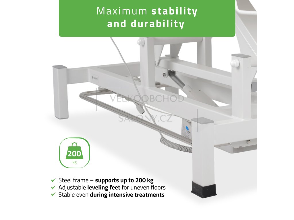 Silné polstrování o tloušťce 7 cm z pěny o hustotě 35 kg/m³ zajišťuje pohodlí klienta i při dlouhodobém ošetření. Stabilní rám umožňuje nosnost až 200 kg, což garantuje bezpečné používání i při vyšším zatížení.