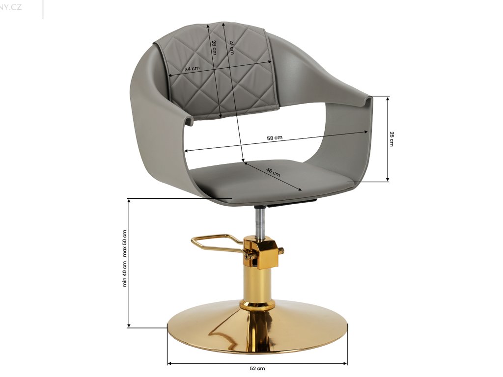 Odolný hydraulický píst umožňuje nastavení výšky sedáku v rozmezí 40–50 cm, a to i během používání. Díky tomu lze křeslo snadno přizpůsobit výšce klienta i pracovním návykům kadeřníka, což podporuje ergonomickou pracovní polohu. Opěradlo poskytuje stabilní oporu zad, ideální i při delších procedurách. Pro ještě větší pohodlí je křeslo vybaveno odnímatelným polštářem na opěradle, potaženým syntetickou kůží a uchyceným pomocí suchých zipů – řešení, které usnadňuje čištění a údržbu.