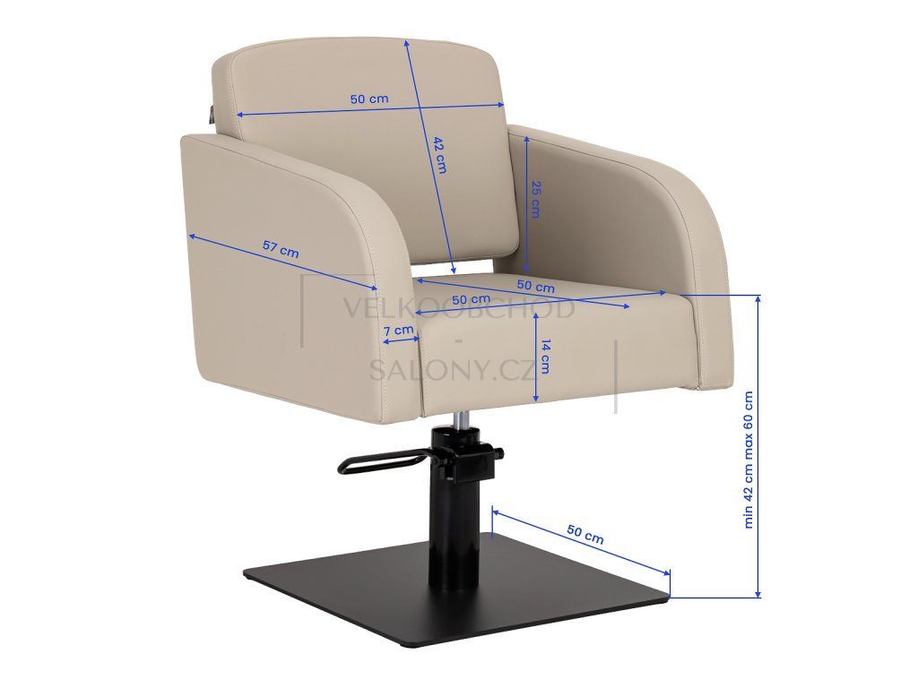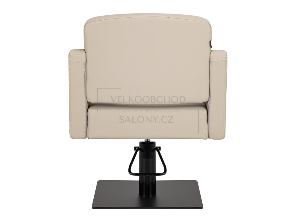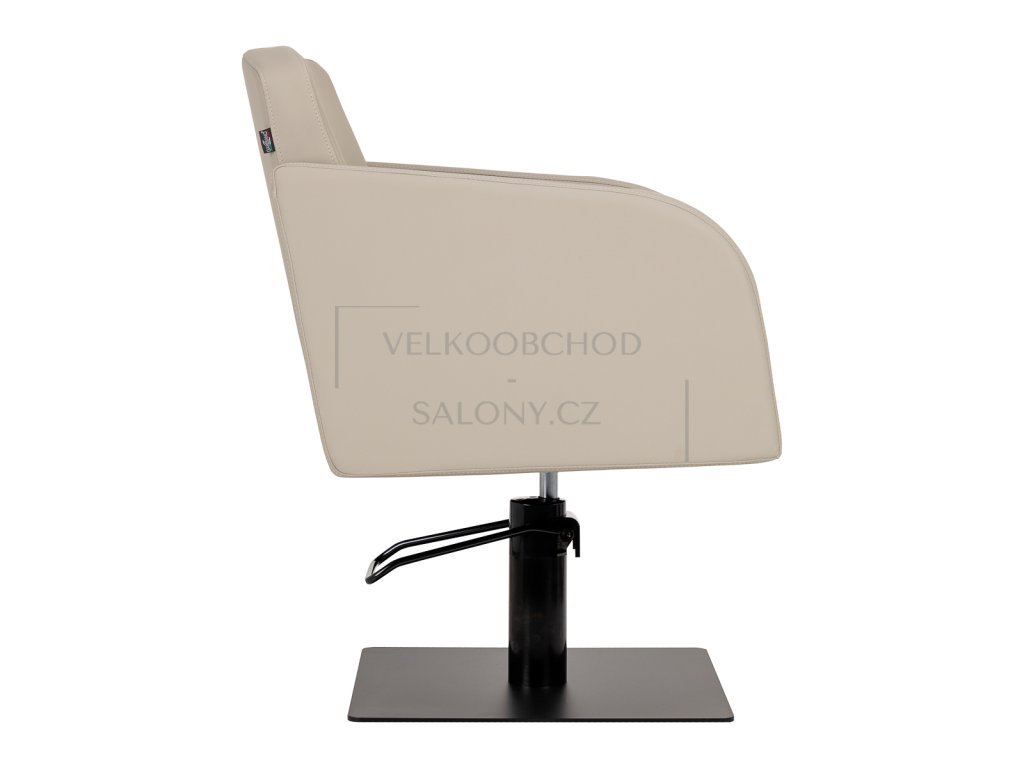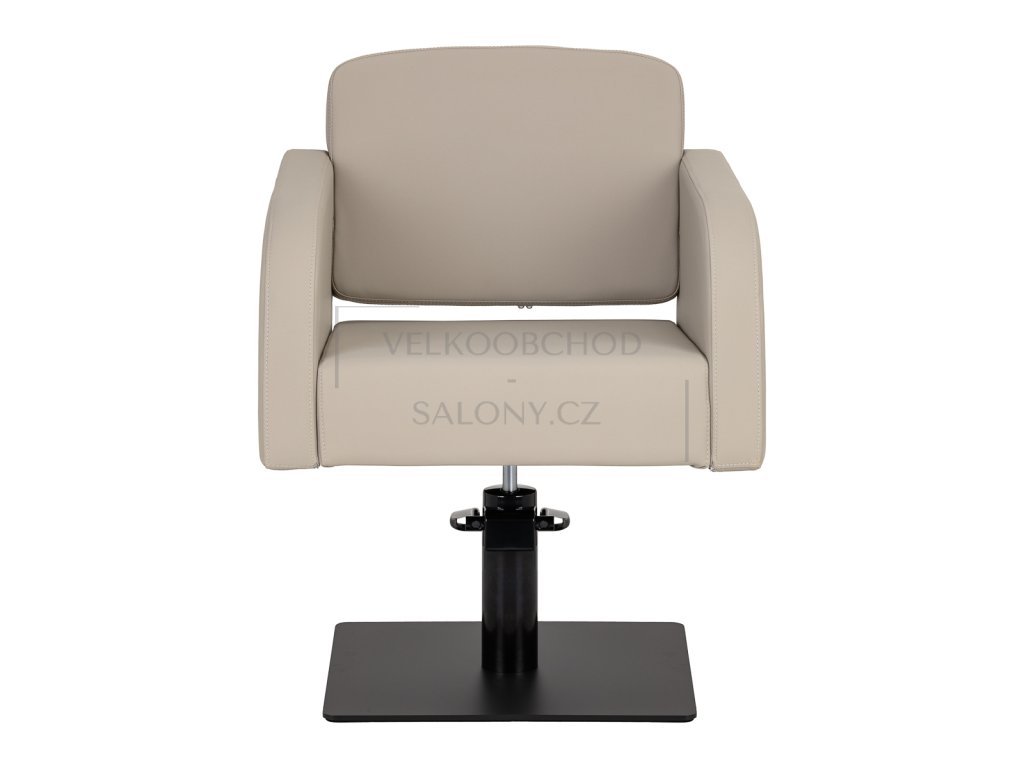 Kadeřnické křeslo Aria - béžové s hydraulickým zdvihem a černou čtvercovou základnou vyniká elegantním designem, pohodlím a odolností. Díky nosnosti 130 kg je ideálním řešením pro profesionální kadeřnické salony, které hledají spojení funkčnosti a stylu.