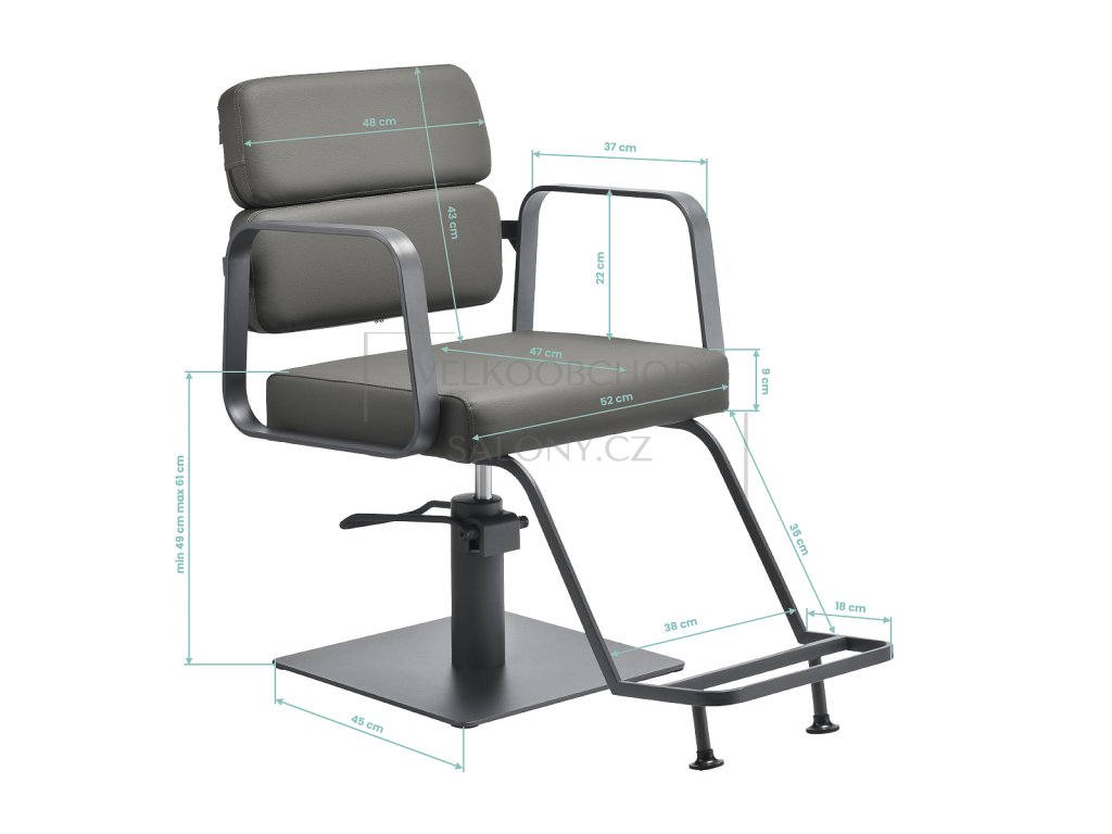 Křeslo je vybaveno hydraulickým podnožníkem, který umožňuje plynulé nastavení výšky v rozmezí 49–61 cm, a to i v okamžiku, kdy na něm klient sedí. Díky tomu je práce pro kadeřníka ergonomická a maximálně pohodlná.