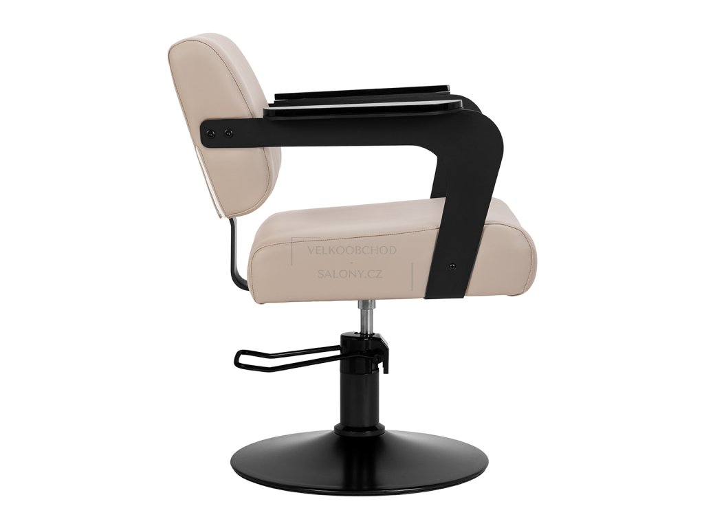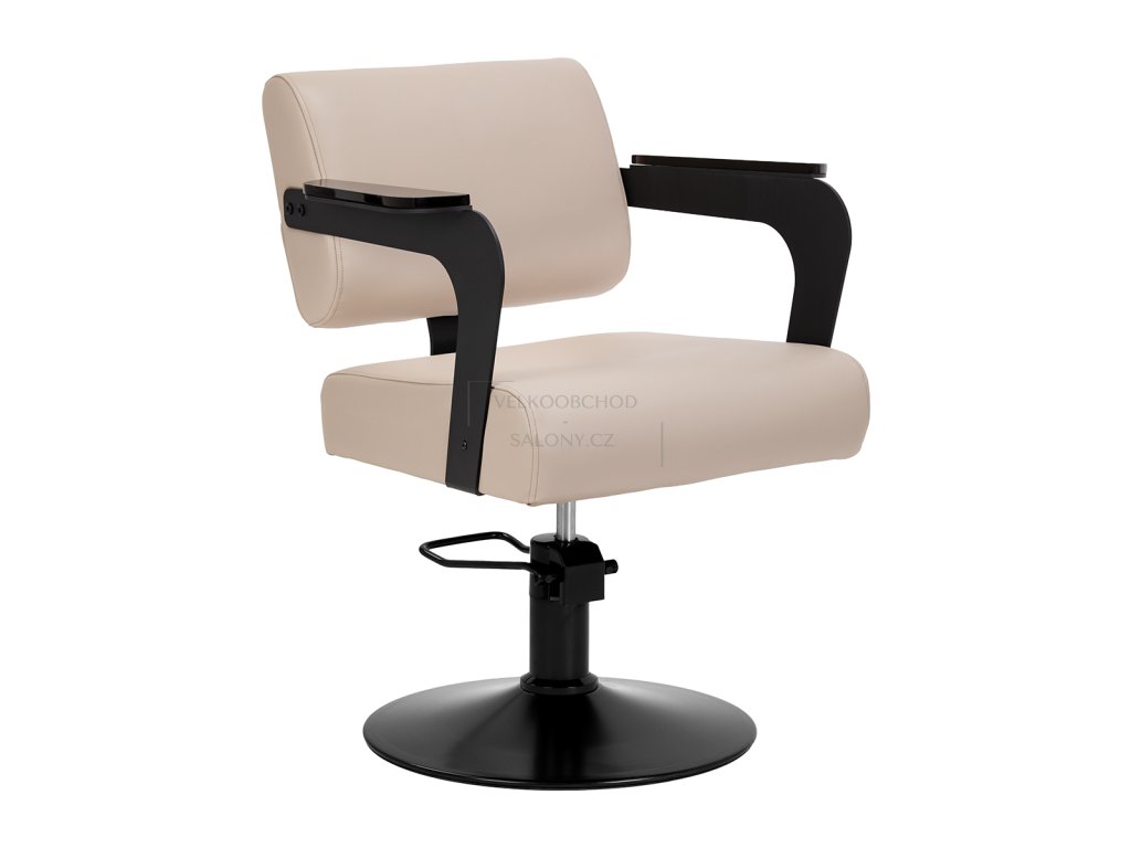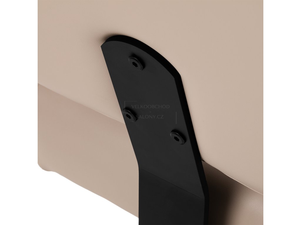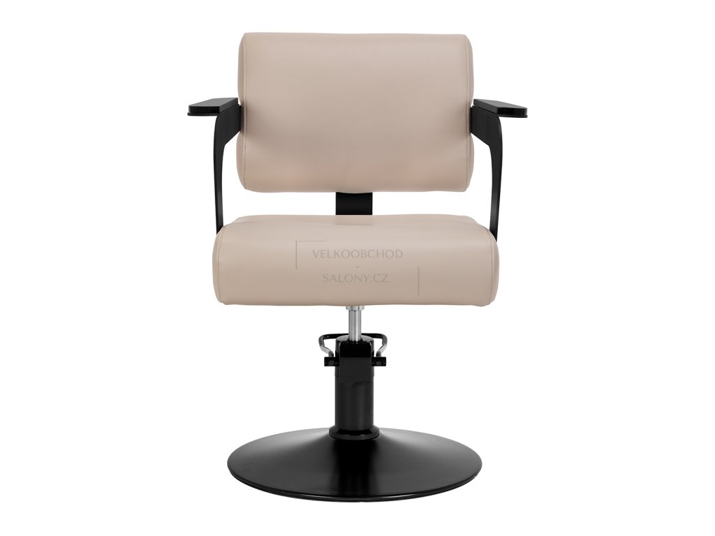 Stabilní kruhová základna v černém provedení zajišťuje bezpečné používání i při vyšším zatížení. Křeslo má nosnost až 130 kg a je vhodné pro široké spektrum klientů. Sedák je vyplněn tvarově stálou pěnou a čalounění ze syntetické kůže v béžových odstínech je odolné proti vlhkosti, snadno omyvatelné a přizpůsobené intenzivnímu salonnímu provozu.