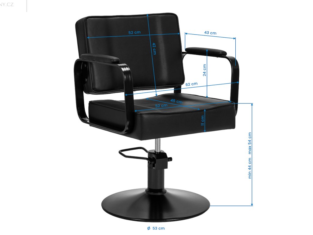 Odolný hydraulický zvedák umožňuje nastavení výšky sedáku v rozmezí 44–54 cm, a to i v případě, že klient na křesle sedí. Kadeřník si tak může pracovní pozici snadno přizpůsobit své výšce i výšce klienta. Profilované opěradlo poskytuje stabilní oporu zad, což je důležité zejména při delších procedurách. Jeho tvar umožňuje pohodlný přístup ke krku, šíji a vlasové linii, což podporuje přesné stříhání, styling i barvení vlasů.