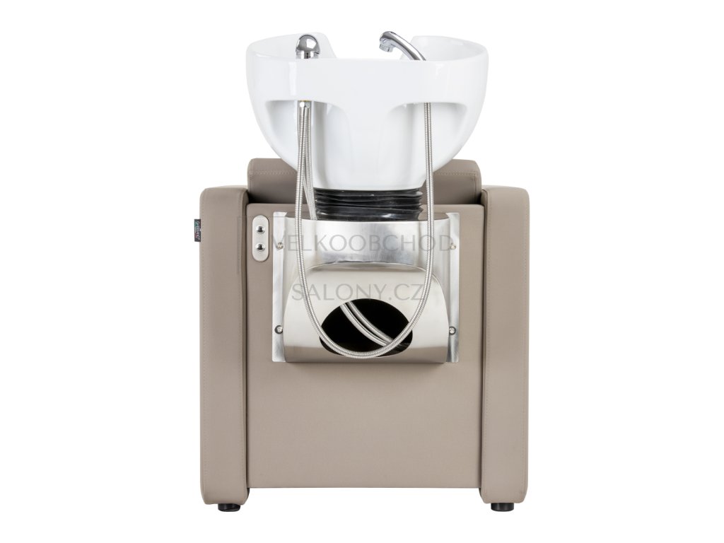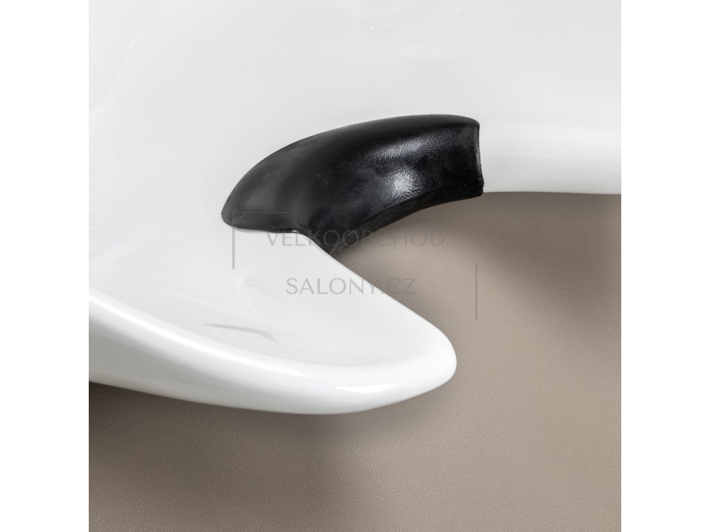Hluboká keramická mísa v bílém odstínu je vysoce odolná vůči poškrábání a zabarvení, snadno se čistí a zabraňuje nechtěnému rozstřiku vody. Ergonomický tvar košíře i měkká černá podložka pod krk poskytují klientovi maximální pohodlí.