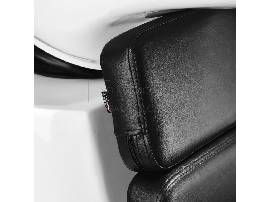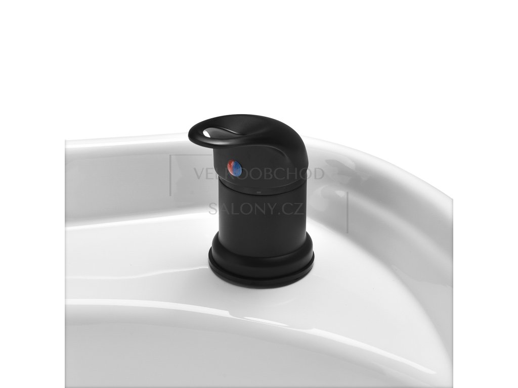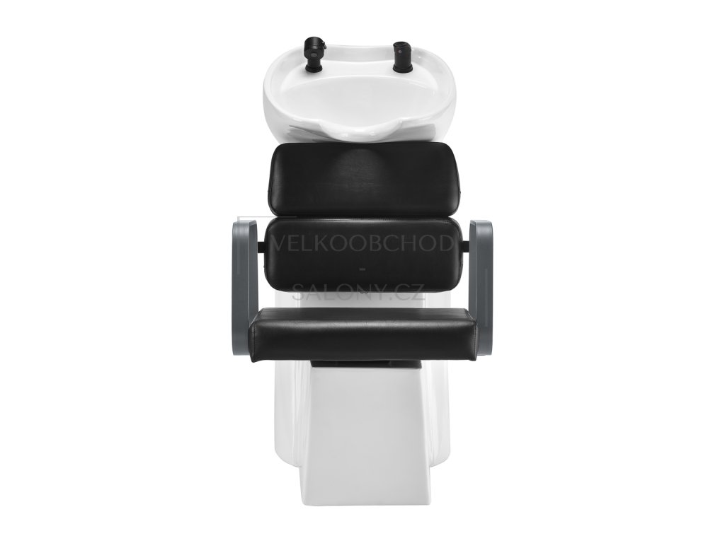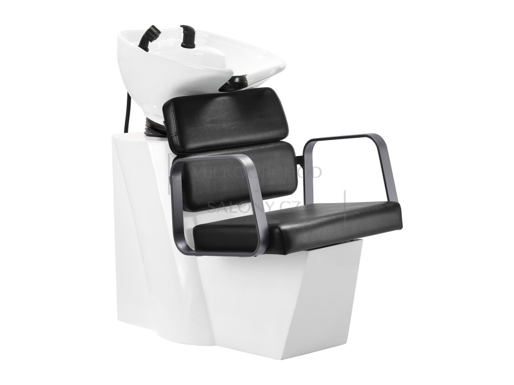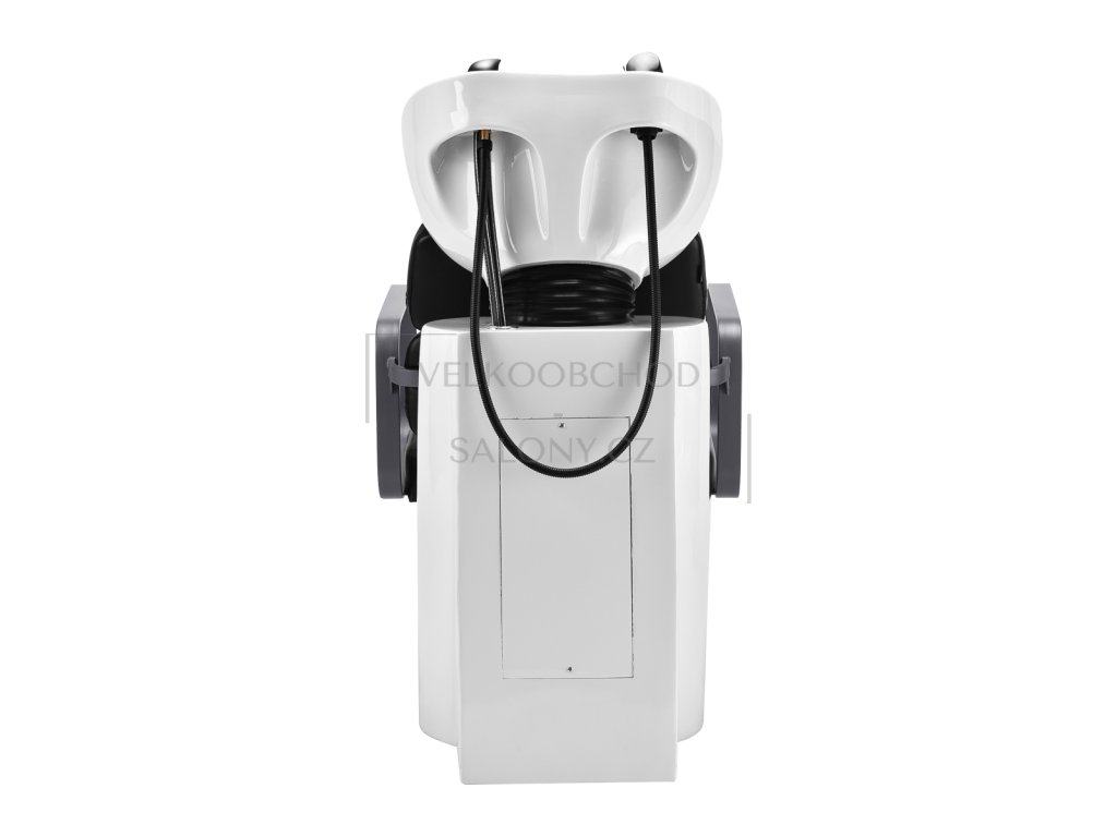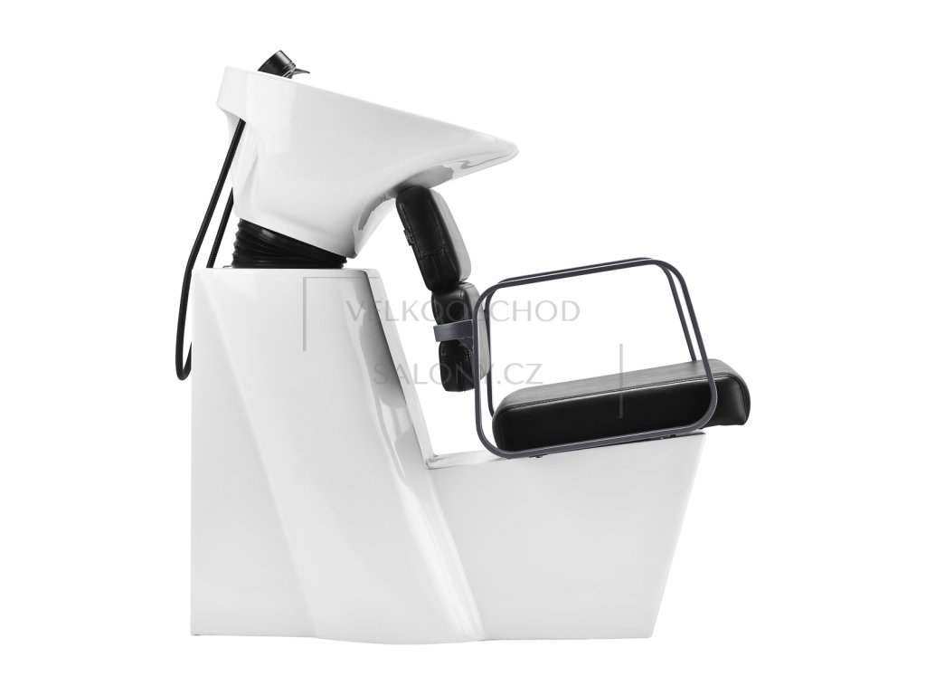 Dominantním prvkem je bílá keramická mísa, odolná vůči skvrnám, poškrábání a vysokému zatížení. Její nastavitelný sklon umožňuje snadné přizpůsobení podle potřeb klienta i stylisty. Pohodlí při mytí zajišťuje ergonomicky tvarovaný krk s měkkou černou opěrkou, která eliminuje nepříjemný chlad keramiky.