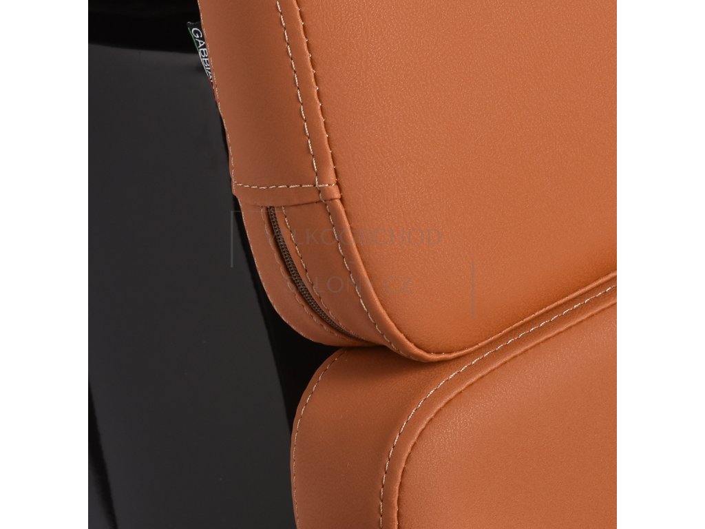 Čalounění v pomerančovém odstínu je vyrobeno z kvalitní syntetické kůže, která je příjemná na dotek, snadno se čistí a je odolná proti opotřebení. Výplň z pevné pěny poskytuje dlouhou životnost a komfort i při častém používání. Kovové područky v černém designu přispívají k pohodlnému sezení a správné opoře ramen.