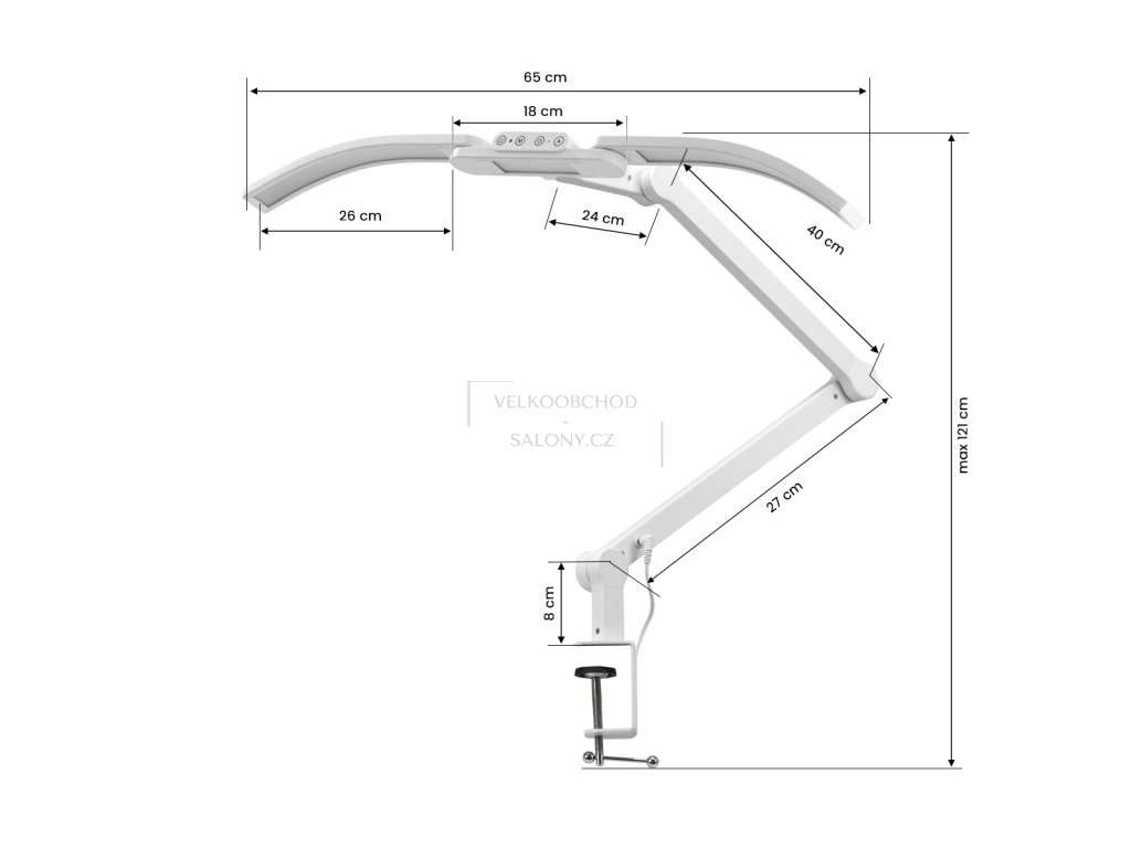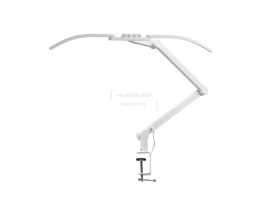 Lampa se upevňuje k pracovní desce pomocí svěrného úchytu na principu imadla s maximálním rozevřením 6,3 cm. Toto řešení je stabilní, bezpečné a zároveň šetří místo na pracovní ploše, což je ideální zejména pro profesionální salony s omezeným prostorem.