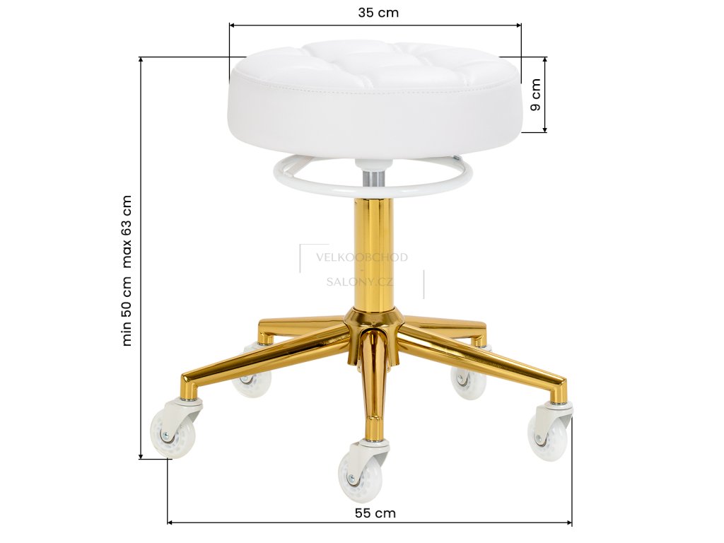 Kosmetický taburet Elegance bílo-zlatý je ideální volbou pro profesionální kosmetické salony, kadeřnictví, barber shopy i specializovaná studia, kde je kladen důraz na komfort, ergonomii a reprezentativní vzhled vybavení. Nadčasová bílo-zlatá barevná kombinace působí luxusně a harmonicky a snadno zapadne do moderních i klasických interiérů.