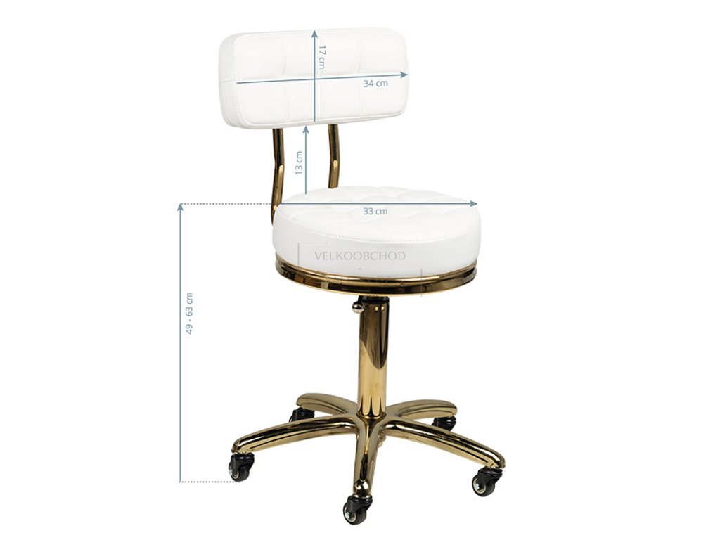 Taburet disponuje pevnou a stabilní konstrukcí s nosností až 120 kg, která zajišťuje bezpečné používání i při každodenním provozu. Pohodlné čalounění poskytuje komfort během delších ošetření, zatímco kombinace bílého čalounění a zlatých detailů dodává taburetu elegantní a profesionální vzhled, který přirozeně zapadne do moderních interiérů salonů.