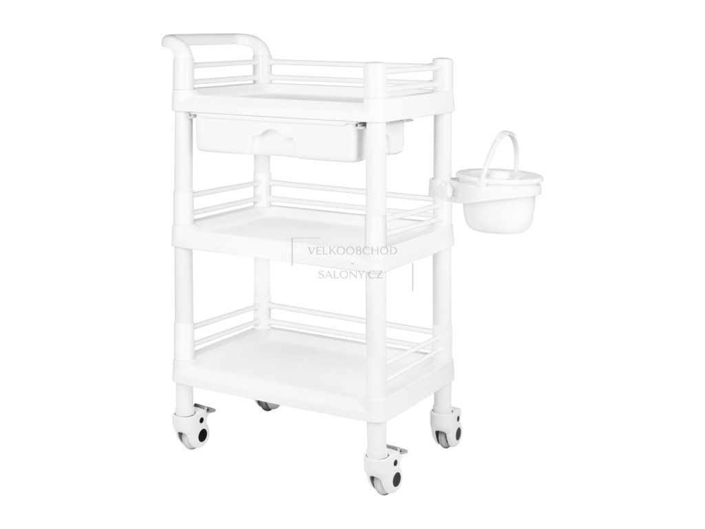 Funkční plastový vozík na gumových kolečkách s brzdami.Vozík má tři police, z nichž jedna je se zásuvkou. Další výhodou vozíků je nádoba na drobný odpad k němu připojená.