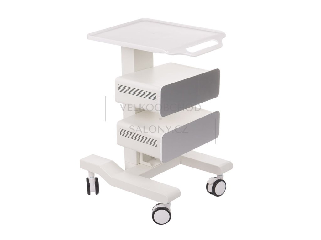 Další výhodou je mobilita – díky kolečkům lze vozík snadno přesunout podle potřeby, a pokud jej chcete zafixovat na jednom místě, pomohou integrované brzdy. Horní pracovní plocha z odolného plastu poskytuje dostatek místa pro pomůcky i přístroje, které potřebujete mít po ruce.