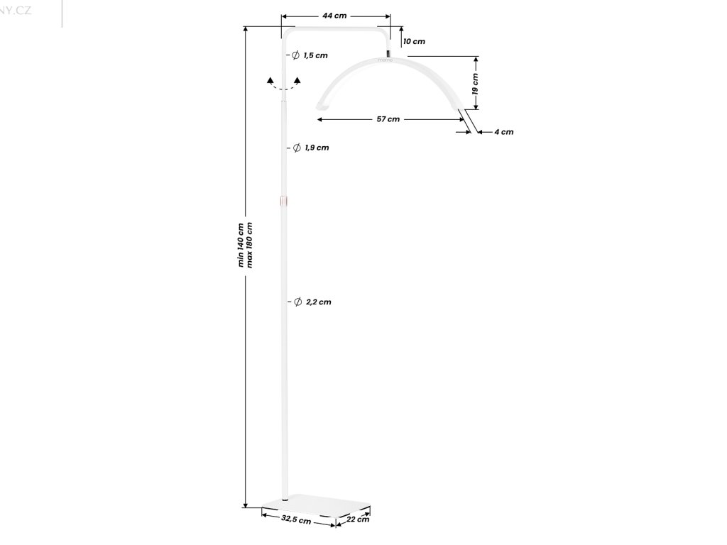 Stativ se snadno nastavuje v rozmezí 140-180 cm pomocí aretačního šroubu umístěného na rameni. To umožňuje přizpůsobit polohu hlavy individuálním potřebám uživatele a různým typům kosmetických křesel, lehátek nebo ošetřovacích stolů a zároveň zajistit vynikající osvětlení pracoviště . Barvu a intenzitu světla lze postupně upravovat pomocí dálkových ovladačů - jeden je umístěn hned vedle lampy, takže je při práci vždy po ruce; druhý umožňuje ovládat nastavení na dálku.