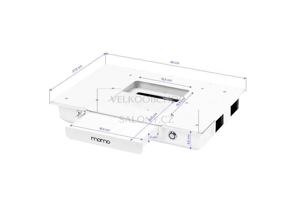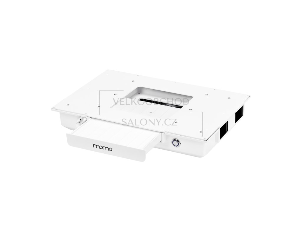 Součástí pracovního stolu je výkonná kazetová odsávačka prachu Momo J-02 s výkonem 48 W, která účinně zachycuje prach vznikající při manikúře. Odsávačka přispívá k čistému pracovnímu prostředí, zvyšuje hygienu a zajišťuje komfort jak pro stylistku, tak i klientku. Její údržba je snadná a filtry lze pravidelně měnit za náhradní (SKU 123581) nebo volit i variantu s aktivním uhlím (SKU 123582) pro vyšší účinnost.