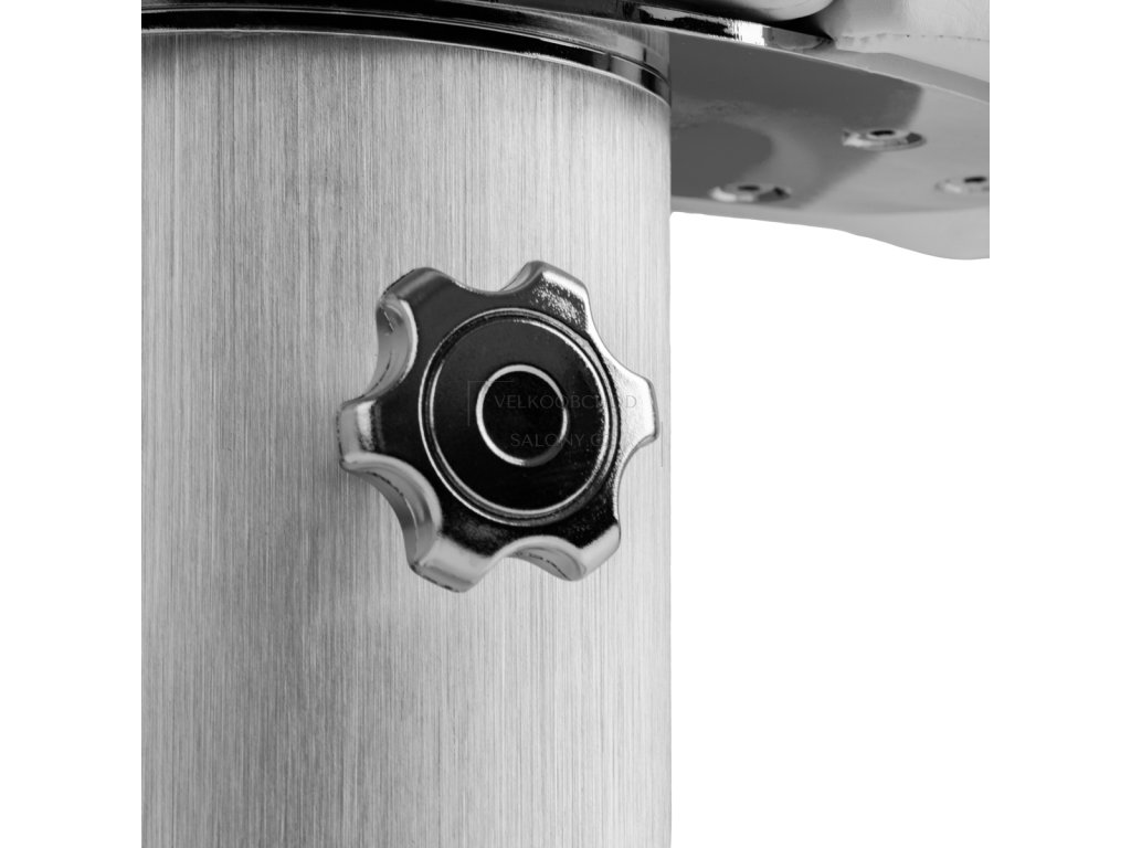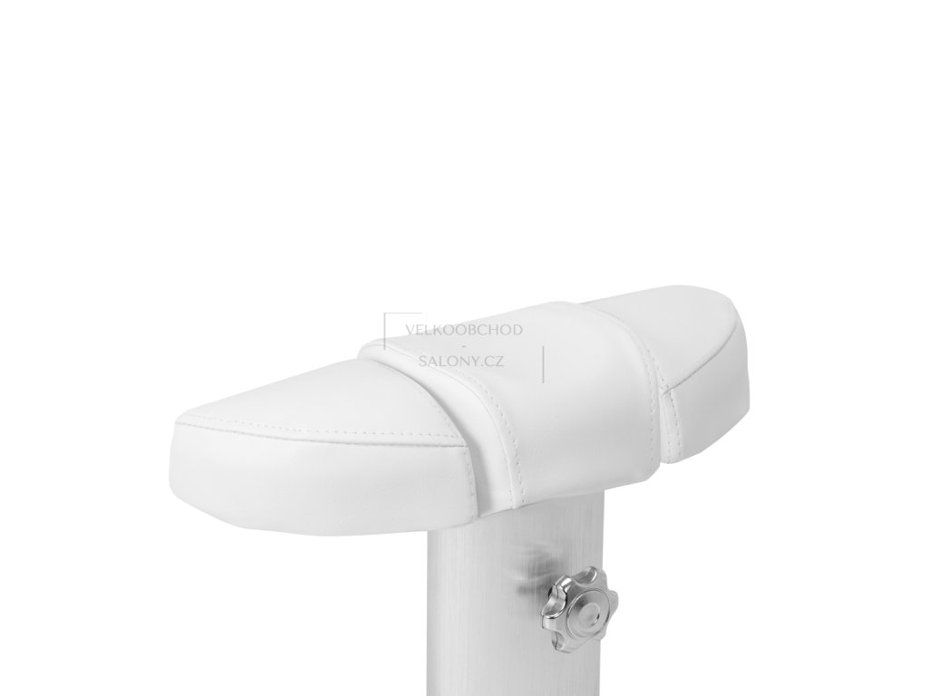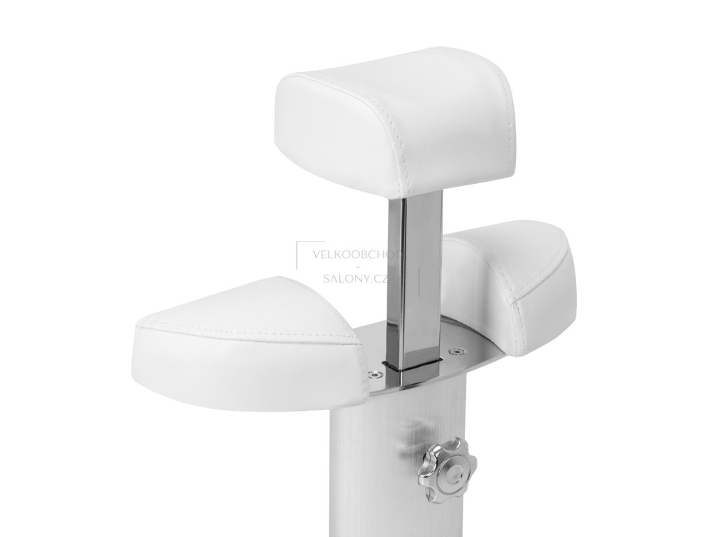 Součástí konstrukce je regulovatelný pojízdný vozík s podnožkou, který umožňuje přizpůsobit výšku podle potřeb klienta i pracovní pozice specialisty. Manuální nastavení výšky až o 20 cm zajišťuje flexibilitu při různých typech ošetření. Čalounění ze syntetické kůže je odolné vůči vlhkosti a snadno se čistí, což je ideální pro každodenní provoz.