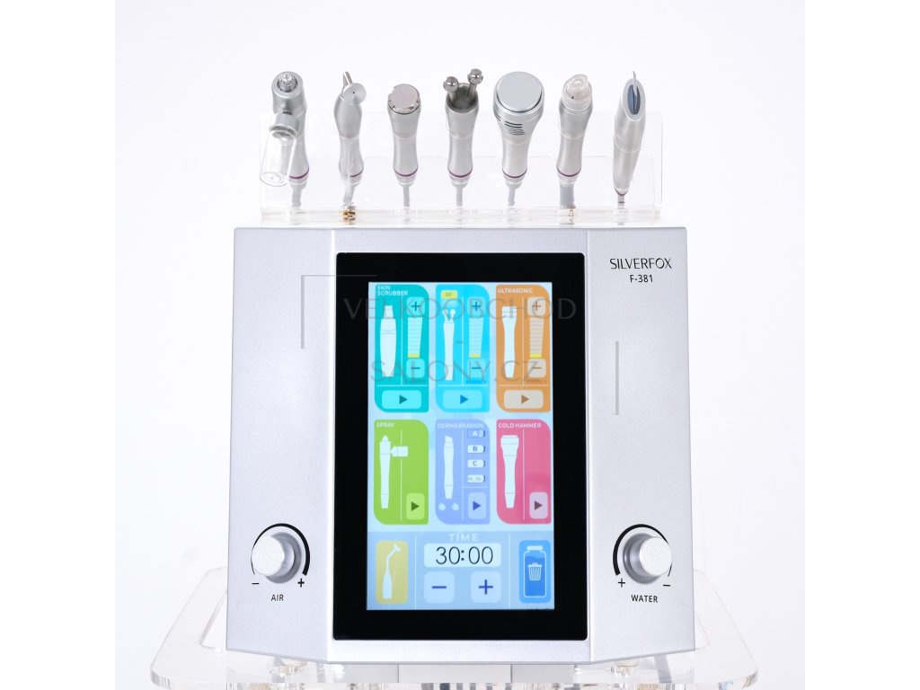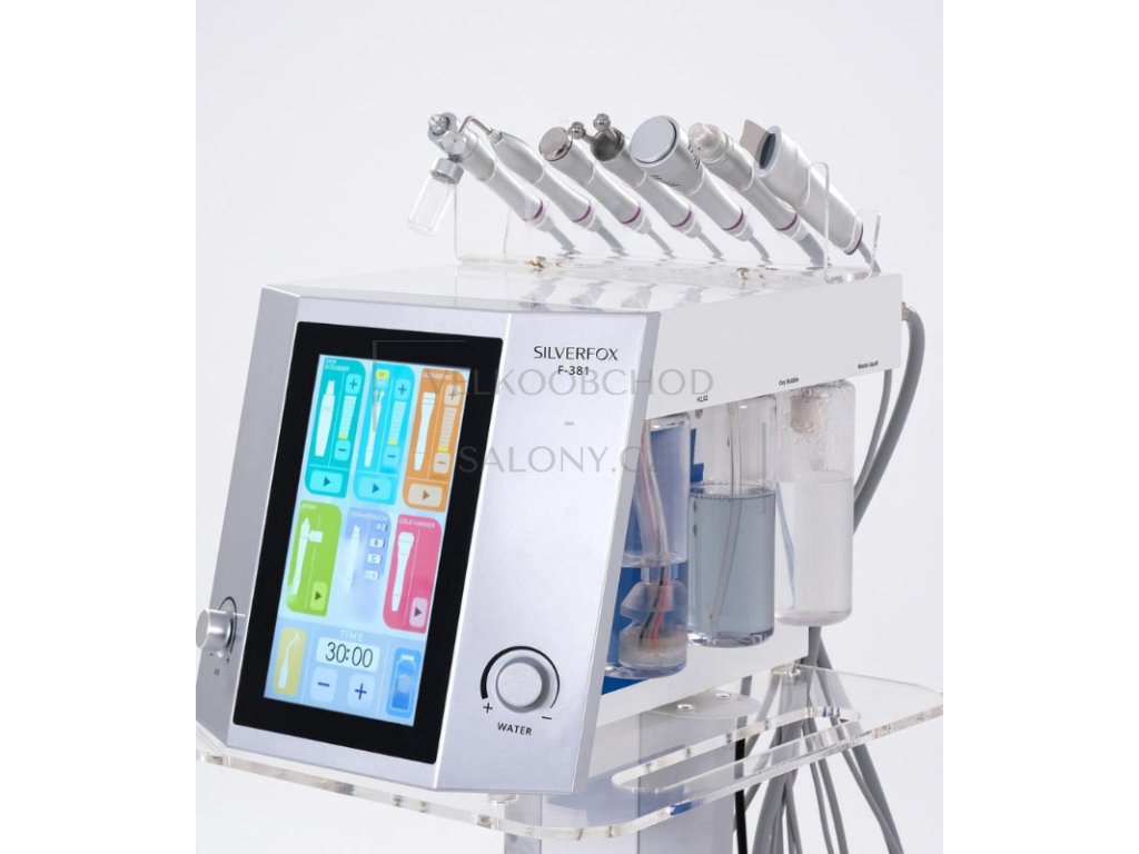Multifunkční kosmetický přístroj F-381 zahrnuje hydrodermabrazi, sprej, ultrazvukovou špachtli, ultrazvuk, radiofrekvenci (EMS), studené kladívko a kyslíkovou bublinu. Přístroj je vybaven velkým LCD displejem a jednoduchým ovládáním.