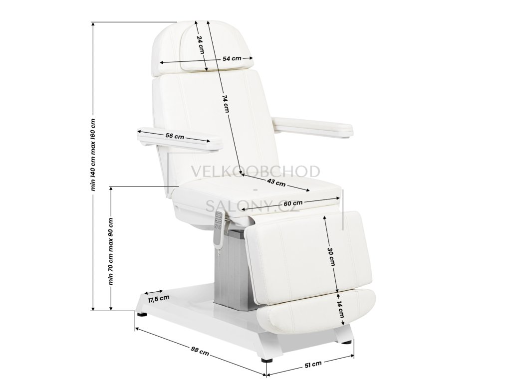 je ideální pro kosmetické salony a SPA salony. Díky nezávislým motorům umožňuje pomocí dálkového ovládání nastavit křeslo ve 3 rovinách, což umožňuje provádět ošetření obličeje i těla. Pomocí dálkového ovladače si můžeme nastavit výšku křesla, sklon opěradla, nastavit sedák do kolébkové polohy. Opěrka nohou je samostatně nastavitelná plynovými pružinami. Další zajímavou funkcí je vícebarevné osvětlení podnože křesla.