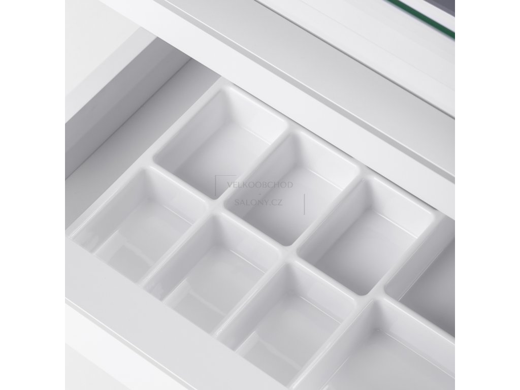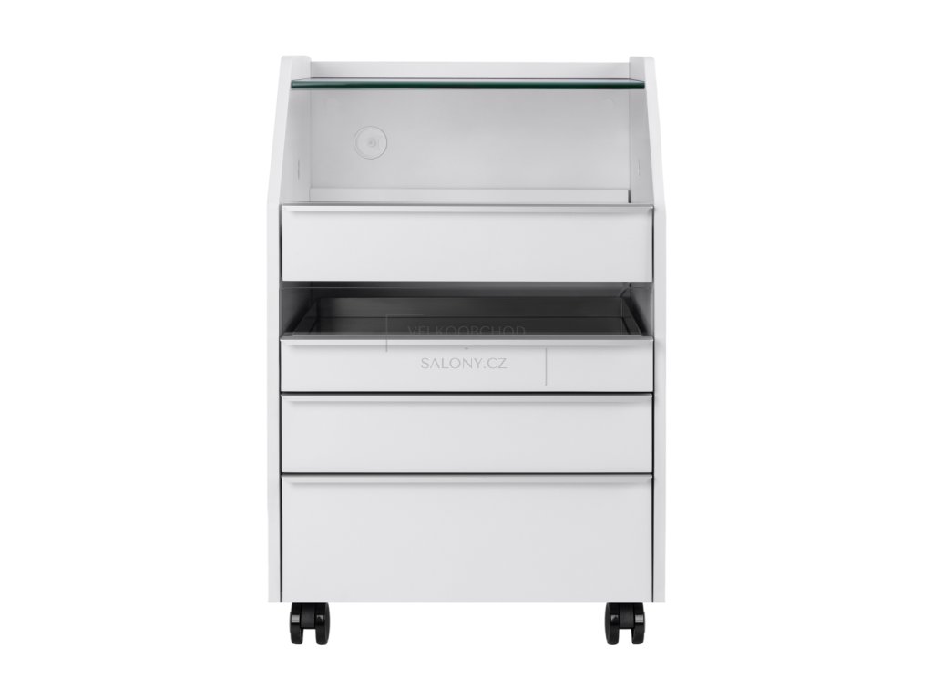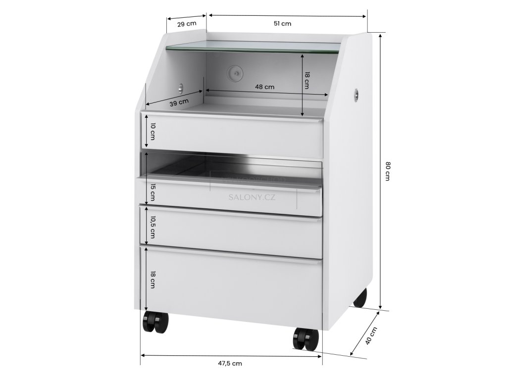 Promyšlené členění úložného prostoru usnadňuje každodenní práci. Horní skleněná police slouží k odkládání nejčastěji používaných nástrojů a pomůcek, zatímco čtyři zásuvky různých rozměrů umožňují systematické uspořádání náčiní, kosmetiky i spotřebního materiálu. Jedna ze zásuvek je vybavena zrcadlovým dnem a vnitřním organizérem, což zlepšuje přehlednost a urychluje práci během ošetření.