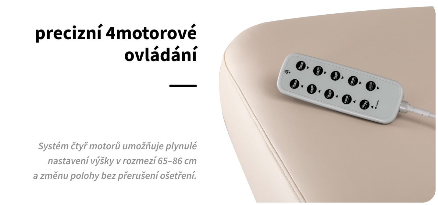 Ovládání probíhá pomocí praktického dálkového ovladače, který umožňuje plynulé a přesné nastavení jednotlivých poloh. Výškové nastavení v rozsahu 65 až 86 cm umožňuje snadno přizpůsobit pracovní výšku podle typu procedury i výšky specialisty.