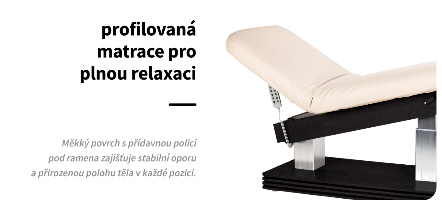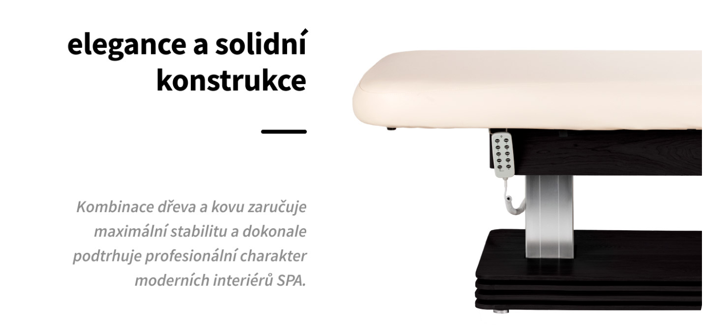 Robustní konstrukce poskytuje spolehlivou oporu i při intenzivním používání v salonu. Kombinace tmavého dřeva a neutrálních barev matrace zároveň vytváří elegantní vzhled, který se perfektně hodí do moderních wellness a kosmetických interiérů.